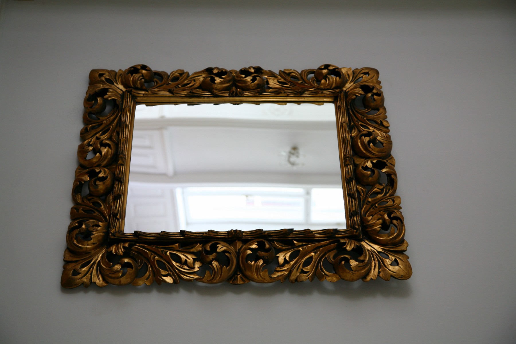 Specchio con cornice in legno dorata e decorazione intagliata a foglie d'acanto