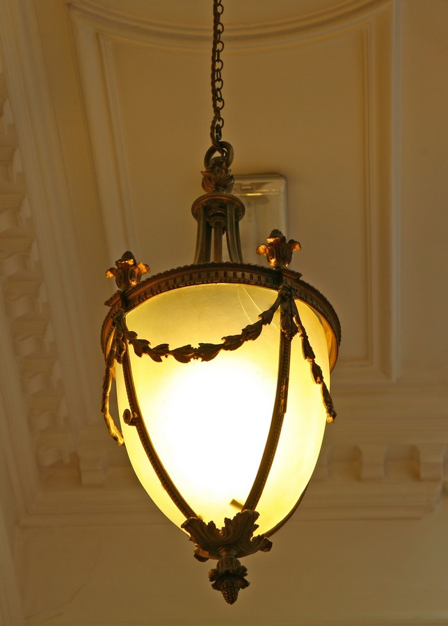 - NOTIZIE STORICO CRITICHE Lampadario in stile Regency (primissimo XIX secolo) di manifattura inglese, realizzato in vetro e ottone. L'oggetto presenta un vetro dalla forma ovale rovesciata a sezione circolare ingabbiato in una struttura in ottone con elementi decorativi che riproducono piccoli festoni vegetali