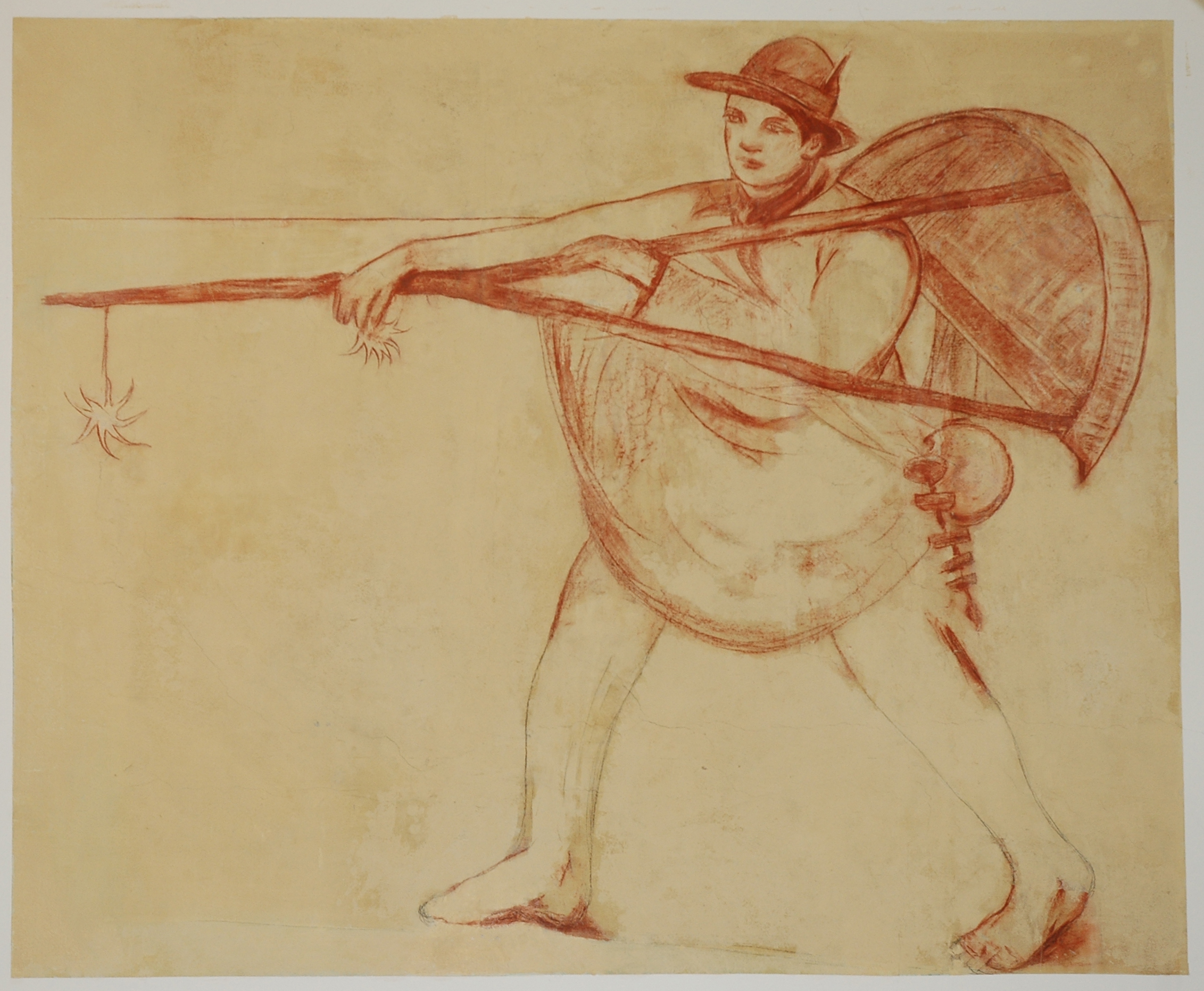 Figura di uomo con cappello che sorregge un rastrello per telline