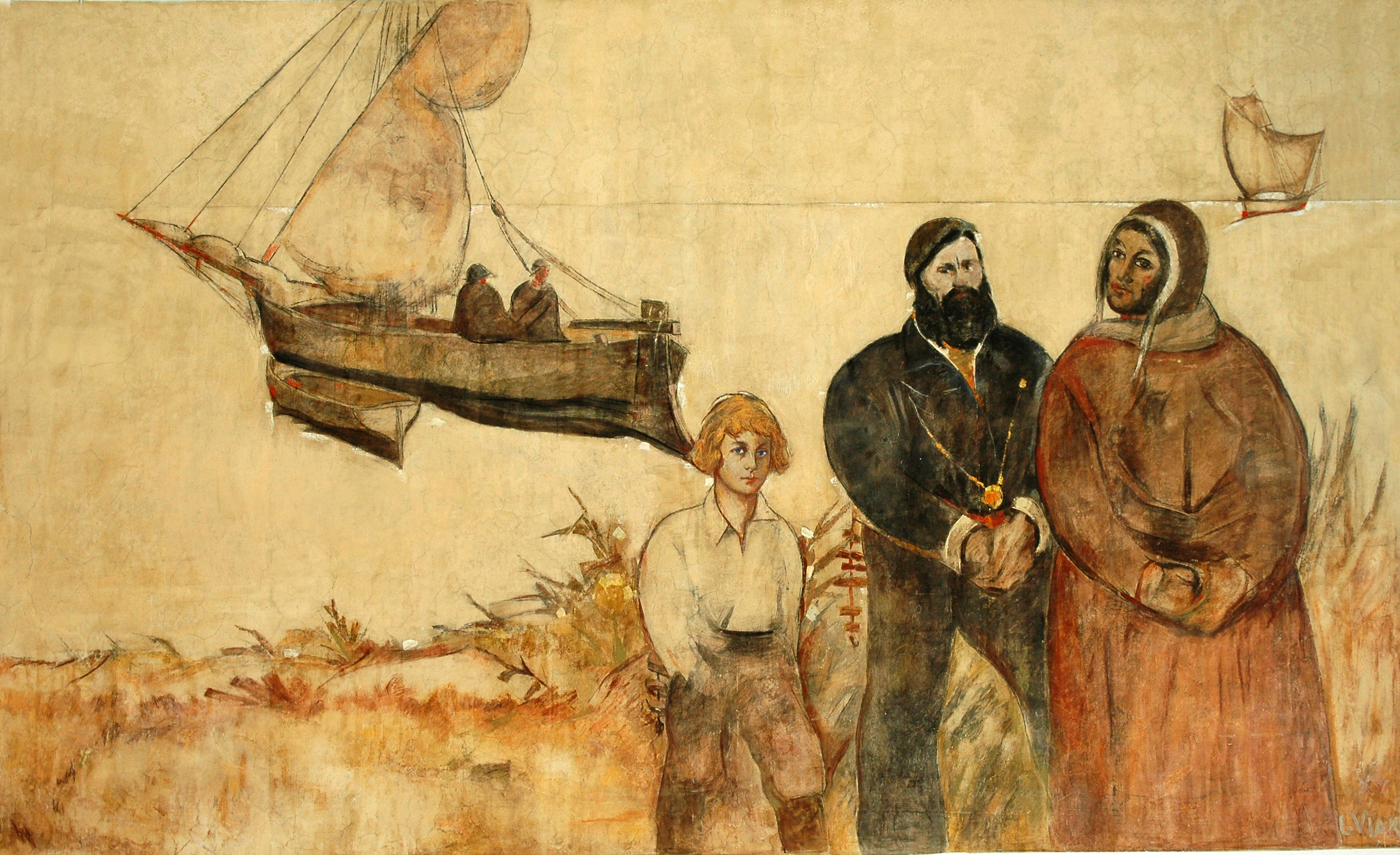 Paesaggio marino con barche. In primo piano due figure maschili ed un fanciullo