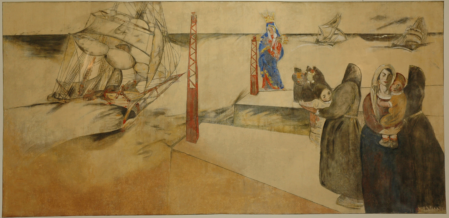 - NOTIZIE STORICO CRITICHE Il motivo dominante è quello dell'ex-voto, lo mostrano in particolare le mogli dei marinai, con in braccio i figlioletti, nell'atto di invocare la Vergine Maria affinché protegga dalla tempesta i propri mariti che si trovano sui tre velieri. La donna in primo piano è mutuata dalla compostezza dei maestri del passato per la solennità dell’impostazione, mentre nella resa della Madonna riemergono le caratteristiche che informano l'Addolorata conservata a Viareggio nella chiesa di S. Andrea (cfr. scheda OA 0900065062). Sul ciclo di Viani a Ostia si rimanda alle informazioni contenute nella scheda madre 1201360305-0