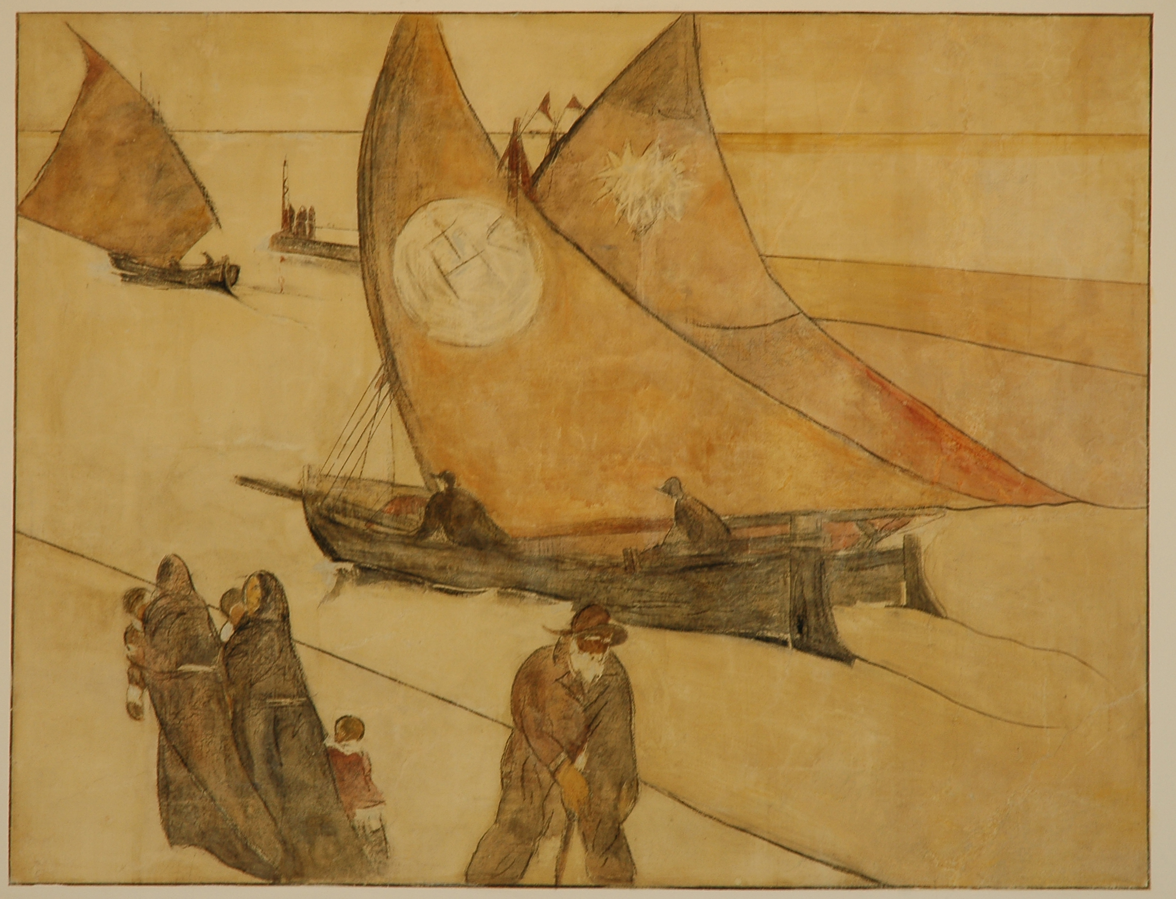 - NOTIZIE STORICO CRITICHE Un equilibrio perfetto quello creato da Viani in questa immagine in cui tutti gli elementi interagiscono armoniosamente, creando un'atmosfera che oscilla tra realtà - per il dialogo armonico tra la costruzione spaziale e i singoli elementi in essa contenuti - e astrazione. Aspetto quest’ultimo messo in risalto dalla Iozzino, la quale, nel commento sull’opera, sottolinea come la mancanza naturalistica del colore, giocato sulle declinazioni del color ocra quale elemento cromatico dominante “fa divenire il soggetto quasi un’entità formale astratta” (Lorenzo Viani…2015, p. 32). Sulla vela in primo piano è visibile il monogramma cristologico IHC sovrastato dalla croce; si tratta di una variante tardo-antica con la “c” al posto della “s”. Sulla vela in secondo piano si nota una specie di stella e, infine, su quella all’estremità sinistra si intravedono dei segni riconducibili probabilmente al monogramma mariano con le lettere “A” e M” intrecciate. "Lungo il molo" e il "Tellinaro", pannello collocato nell’aula Bifulco, sono le uniche due opere del ciclo su cui non è presente la firma del maestro. Sui dipinti murali di Viani a Ostia si rimanda alle informazioni contenute nella scheda madre 1201360305-0