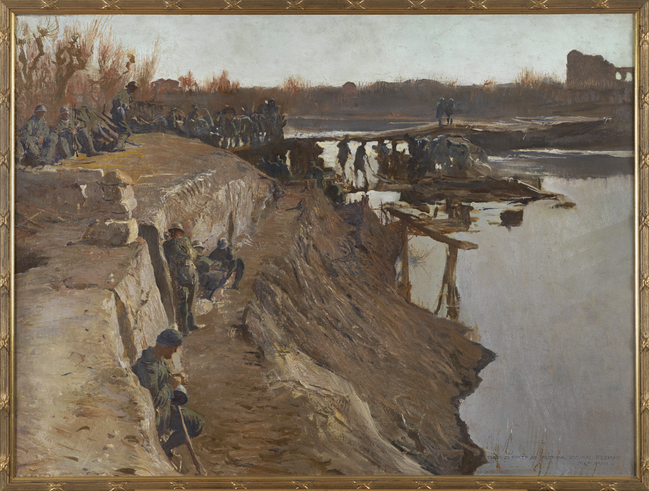 - NOTIZIE STORICO CRITICHE L'opera fa parte del ciclo dei quadri storici, probabilmente più di centosette, eseguiti da Aristide Sartorio, il quale documenta in prima persona, tra 1917 e il 1918, gli eventi bellici del conflitto della prima guerra mondiale. Usualmente per le sue composizioni, oltre agli schizzi da lui realizzati sui campi di battaglia, utilizza, come mezzo strumentale e punto di partenza, delle sue fotografie scattate mediate un apparecchio portatile, o quelle appartenenti al comando supremo dell'esercito italiano, al Fondo Ufficiali del Reparto dei Fotocineamatori. Le foto ufficiali talvolta recano sul retro il timbro "Sezione cinematografica del R. Esercito Italiano" con stemma sabaudo o "Laboratorio Fotografico del Comando Supremo" Sartorio fu uno dei primi pittori ad utilizzare la macchina fotografica, il cui uso, in quegli anni, si stava diffondendo rapidamente, rielaborando e modificando i vari scatti fotografici, ed utilizzando spesso molteplici foto, per poi creare i suoi dipinti. Per quest'opera impiega due fotografie. Le pitture raffigurano scene che l'artista vive in prima persona, sui campi di battaglia, in diverse zone del fronte, quando, liberato dopo due anni di prigionia, per l'eccezionale intercessione del Papa Benedetto XV, tornò volontario nelle zone di combattimento con il grado di sottotenente di cavalleria e assistette alla ritirata del Piave e alla riconquista del Delta. L'artista riporta, su tutte le opere, le indicazioni della località e della data di realizzazione del dipinto, per attestare le varie fasi del conflitto che coinvolse non solo gli uomini, ma anche i luoghi, dove il paesaggio diventa protagonista e rimanda a scenari di morte e di dolore. Sartorio nel 1924 fu nominato Commissario per le Arti e si recò in viaggio in Sud America sulla Regia Nave Italia. La crociera, organizzata su proposta di Gabriele D'Annunzio, durò otto mesi, ed era una esposizione per dimostrare il lavoro, la capacità e l'espressione artistica italiana, con lo scopo di diffondere la cultura e gli articoli italiani. L'artista portò con sé cento delle sue opere, tra le quali, sessantuno quadri a tema storico e tutti dipinti ad olio. Durante il viaggio furono visitate 40 città, nella tappa della nave del 21 aprile 1924, a San Paolo del Brasile, venne allestita una mostra con settantotto quadri di Sartorio e qui degli immigrati veneti acquistarono cinquantotto quadri dei sessantuno, dedicati alla Grande Guerra, per poi farne dono al Circolo Italiano di San Paolo, l'atto di donazione è del 6 maggio 1924. I quadri dell'artista non imbarcati sulla Regia Nave, circa quaranta, rimasero nello studio di Sartorio, alcuni venduti e altri, cinque oli e ventitré pastelli, ceduti nel 1934 al Museo Civico di Milano, dove è possibile ammirarli presso le Civiche Raccolte Storiche a Palazzo Moriggia. Alcuni quadri, conservati al Castello Sforzesco e provenienti dalla vedova Sartorio, andarono distrutti durante il bombardamento della seconda guerra mondiale, avvenuto nel 1943 e, di questi sono stati recuperati solo dodici pastelli. Le opere di Sartorio dedicate a "La Battaglia del Piave" testimonianza degli eventi bellici che si svolsero al confine tra Trentino e Veneto, tra il Regio Esercito italiano da una parte e le forze dell'Impero tedesco e dell'Impero austro-ungarico dall'altra e tutto ciò che è avvenuto fino al momento in cui il Delta venne riconquistato, stavano per essere vendute all'asta. Per questa ragione e per poter tutelare il ciclo pittorico, composto di disegni, oli e tempere, come documentazione sia storica che artistica di quel tragico periodo, nel 2000, appena reperiti i fondi necessari, l'intero complesso fu acquistato e restaurato dallo Stato italiano, dal Ministero degli Affari Esteri e della Cooperazione Internazionale. La presa in carico è datata 2003. Nell'archivio storico degli eredi Sartorio si conservano molte fotografie del pittore, del periodo bellico nelle quali, il più delle volte, è indicato anche il rimando al quadro di riferimento. Le mostre personali dell'artista dove furono esposte le opere aventi per soggetto la prima guerra mondiale furono le seguenti: vennero esposti una prima volta a Roma, in Campidoglio, nel gennaio del 1918 con la "Mostra degli studi e dei quadri eseguiti da Sartorio al Fronte Italiano", dove l’artista espose quarantacinque pezzi, venti dei quali riprodotti in cartolina dalla Casa d'Arte Bestetti e Tuminelli. A seguire, il 17 novembre del 1918, la "Mostra Nazionale della Guerra di Bologna" promossa dall'Associazione Nazionale per i Paesaggi e Monumenti Pittoreschi d'Italia, Palazzo Bonora. All'esposizione furono invitati a partecipare diversi artisti italiani, quasi tutti coinvolti nel conflitto e, soggetto comune, a tutti i quadri, era il tema della guerra. Le cento opere di Sartorio furono esposte nel loggiato al primo piano del Palazzo Bonora e ricevettero un grande interesse sia da parte della critica che dei visitatori, rimasero in mostra solo fino al 26 dicembre per poi essere esposte a Parigi e successivamente a Madrid. Il 21 di aprile 1924 nella tappa che fece la Regia Nave a San Paolo del Brasile, venne allestita una mostra con settantotto quadri ad olio di Sartorio. Dal 9 marzo al 24 aprile 1933 "Pitture di Giulio Aristide Sartorio" presso la Regia Galleria Borghese a Roma, Reale Accademia d'Italia. Cento opere furono inviate dal pittore, prima della sua morte avvenuta il 3 ottobre del 1932; era l'artista più anziano di tutti quelli presenti in mostra. "Giulio Aristide Sartorio: figura e decorazione", Roma, Palazzo di Montecitorio, Sala della Regina, dal 2 febbraio all’11 marzo 1989. "Giulio Aristide Sartorio 1924: Crociera della Regia Nave Italia nell'America Latina", a cura di Bruno Mantura, Maria Paola Maino, Bernardino Osio e Ludovico Incisa di Camerana presso Istituto Italo-Latino Americano (IILA) di Roma, dal 9 dicembre 1999 al 5 febbraio 2000. "Giulio Aristide Sartorio, la Battaglia sul P