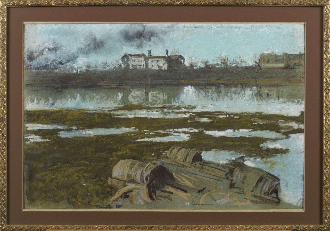 - NOTIZIE STORICO CRITICHE L'opera fa parte del ciclo dei quadri storici, probabilmente più di centosette, eseguiti da Aristide Sartorio, il quale documenta in prima persona, tra 1917 e il 1918, gli eventi bellici del conflitto della prima guerra mondiale. Usualmente per le sue composizioni, oltre agli schizzi da lui realizzati sui campi di battaglia, utilizza, come mezzo strumentale e punto di partenza, delle sue fotografie scattate mediate un apparecchio portatile, o quelle appartenenti al comando supremo dell'esercito italiano, al Fondo Ufficiali del Reparto dei Fotocineamatori. Le foto ufficiali talvolta recano sul retro il timbro "Sezione cinematografica del R. Esercito Italiano" con stemma sabaudo o "Laboratorio Fotografico del Comando Supremo" Sartorio fu uno dei primi pittori ad utilizzare la macchina fotografica, il cui uso, in quegli anni, si stava diffondendo rapidamente, rielaborando e modificando i vari scatti fotografici, ed utilizzando spesso molteplici foto, per poi creare i suoi dipinti. Per quest'opera impiega una fotografia. Le pitture raffigurano scene che l'artista vive in prima persona, sui campi di battaglia, in diverse zone del fronte, quando, liberato dopo due anni di prigionia, per l'eccezionale intercessione del Papa Benedetto XV, tornò volontario nelle zone di combattimento con il grado di sottotenente di cavalleria e assistette alla ritirata del Piave e alla riconquista del Delta. L'artista riporta, su tutte le opere, le indicazioni della località e della data di realizzazione del dipinto, per attestare le varie fasi del conflitto che coinvolse non solo gli uomini, ma anche i luoghi, dove il paesaggio diventa protagonista e rimanda a scenari di morte e di dolore. Sartorio nel 1924 fu nominato Commissario per le Arti e si recò in viaggio in Sud America sulla Regia Nave Italia. La crociera, organizzata su proposta di Gabriele D'Annunzio, durò otto mesi, ed era una esposizione per dimostrare il lavoro, la capacità e l’espressione artistica italiana, con lo scopo di diffondere la cultura e gli articoli italiani. L'artista portò con sé cento delle sue opere, tra le quali, sessantuno quadri a tema storico e tutti dipinti ad olio. Durante il viaggio furono visitate 40 città, nella tappa della nave del 21 aprile 1924, a San Paolo del Brasile, venne allestita una mostra con settantotto quadri di Sartorio e qui degli immigrati veneti acquistarono cinquantotto quadri dei sessantuno, dedicati alla Grande Guerra, per poi farne dono al Circolo Italiano di San Paolo, l'atto di donazione è del 6 maggio 1924. I quadri dell'artista non imbarcati sulla Regia Nave, circa quaranta, rimasero nello studio di Sartorio, alcuni venduti e altri, cinque oli e ventitré pastelli, ceduti nel 1934 al Museo Civico di Milano, dove è possibile ammirarli presso le Civiche Raccolte Storiche a Palazzo Moriggia. Alcuni quadri, conservati al Castello Sforzesco e provenienti dalla vedova Sartorio, andarono distrutti durante il bombardamento della seconda guerra mondiale, avvenuto nel 1943 e, di questi sono stati recuperati solo dodici pastelli. Le opere di Sartorio dedicate a "La Battaglia del Piave" testimonianza degli eventi bellici che si svolsero al confine tra Trentino e Veneto, tra il Regio Esercito italiano da una parte e le forze dell'Impero tedesco e dell'Impero austro-ungarico dall'altra e tutto ciò che è avvenuto fino al momento in cui il Delta venne riconquistato, stavano per essere vendute all'asta. Per questa ragione e per poter tutelare il ciclo pittorico, composto di disegni, oli e tempere, come documentazione sia storica che artistica di quel tragico periodo, nel 2000, appena reperiti i fondi necessari, l'intero complesso fu acquistato e restaurato dallo Stato italiano, dal Ministero degli Affari Esteri e della Cooperazione Internazionale. La presa in carico è datata 2003. Nell'archivio storico degli eredi Sartorio si conservano molte fotografie del pittore, del periodo bellico nelle quali, il più delle volte, è indicato anche il rimando al quadro di riferimento. Le mostre personali dell'artista dove furono esposte le opere aventi per soggetto la prima guerra mondiale furono le seguenti: vennero esposti una prima volta a Roma, in Campidoglio, nel gennaio del 1918 con la "Mostra degli studi e dei quadri eseguiti da Sartorio al Fronte Italiano", dove l’artista espose quarantacinque pezzi, venti dei quali riprodotti in cartolina dalla Casa d'Arte Bestetti e Tuminelli. A seguire, il 17 novembre del 1918, la "Mostra Nazionale della Guerra di Bologna" promossa dall'Associazione Nazionale per i Paesaggi e Monumenti Pittoreschi d'Italia, Palazzo Bonora. All'esposizione furono invitati a partecipare diversi artisti italiani, quasi tutti coinvolti nel conflitto e, soggetto comune, a tutti i quadri, era il tema della guerra. Le cento opere di Sartorio furono esposte nel loggiato al primo piano del Palazzo Bonora e ricevettero un grande interesse sia da parte della critica che dei visitatori, rimasero in mostra solo fino al 26 dicembre per poi essere esposte a Parigi e successivamente a Madrid. Il 21 di aprile 1924 nella tappa che fece la Regia Nave a San Paolo del Brasile, venne allestita una mostra con settantotto quadri ad olio di Sartorio. Dal 9 marzo al 24 aprile 1933 "Pitture di Giulio Aristide Sartorio" presso la Regia Galleria Borghese a Roma, Reale Accademia d'Italia. Cento opere furono inviate dal pittore, prima della sua morte avvenuta il 3 ottobre del 1932; era l'artista più anziano di tutti quelli presenti in mostra. "Giulio Aristide Sartorio: figura e decorazione", Roma, Palazzo di Montecitorio, Sala della Regina, dal 2 febbraio all’11 marzo 1989. "Giulio Aristide Sartorio 1924: Crociera della Regia Nave Italia nell'America Latina", a cura di Bruno Mantura, Maria Paola Maino, Bernardino Osio e Ludovico Incisa di Camerana presso Istituto Italo-Latino Americano (IILA) di Roma, dal 9 dicembre 1999 al 5 febbraio 2000. "Giulio Aristide Sartorio, la Battaglia sul