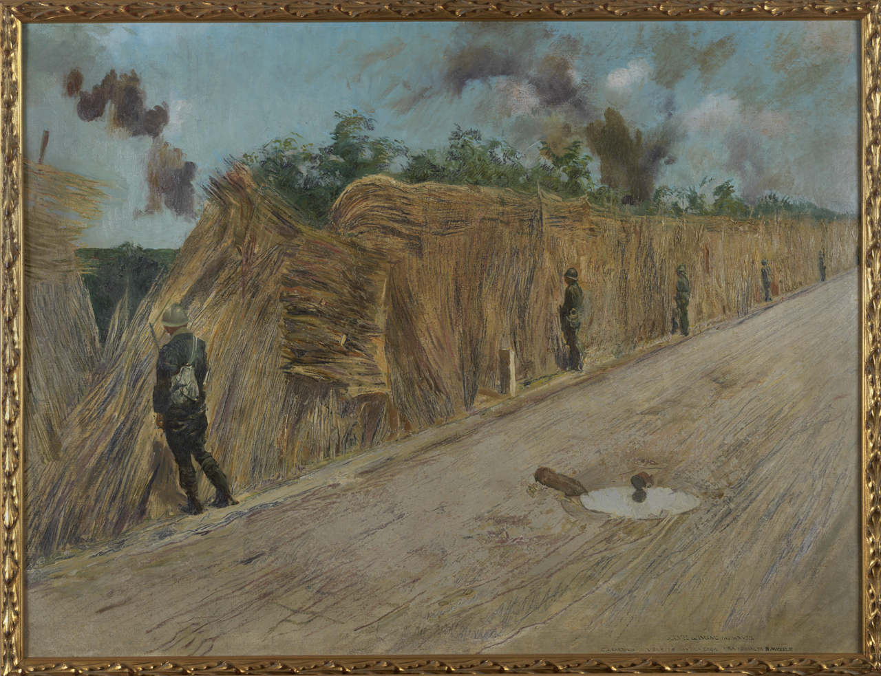 - NOTIZIE STORICO CRITICHE L'opera fa parte del ciclo dei quadri storici, probabilmente più di centosette, eseguiti da Aristide Sartorio, il quale documenta in prima persona, tra 1917 e il 1918, gli eventi bellici del conflitto della prima guerra mondiale. Usualmente per le sue composizioni, oltre agli schizzi da lui realizzati sui campi di battaglia, utilizza, come mezzo strumentale e punto di partenza, delle sue fotografie scattate mediate un apparecchio portatile, o quelle appartenenti al comando supremo dell'esercito italiano, al Fondo Ufficiali del Reparto dei Fotocineamatori. Le foto ufficiali talvolta recano sul retro il timbro "Sezione cinematografica del R. Esercito Italiano" con stemma sabaudo o "Laboratorio Fotografico del Comando Supremo" Sartorio fu uno dei primi pittori ad utilizzare la macchina fotografica, il cui uso, in quegli anni, si stava diffondendo rapidamente, rielaborando e modificando i vari scatti fotografici, ed utilizzando spesso molteplici foto, per poi creare i suoi dipinti. Le pitture raffigurano scene che l'artista vive in prima persona, sui campi di battaglia, in diverse zone del fronte, quando, liberato dopo due anni di prigionia, per l'eccezionale intercessione del Papa Benedetto XV, tornò volontario nelle zone di combattimento con il grado di sottotenente di cavalleria e assistette alla ritirata del Piave e alla riconquista del Delta. L'artista riporta, su tutte le opere, le indicazioni della località e della data di realizzazione del dipinto, per attestare le varie fasi del conflitto che coinvolse non solo gli uomini, ma anche i luoghi, dove il paesaggio diventa protagonista e rimanda a scenari di morte e di dolore. Sartorio nel 1924 fu nominato Commissario per le Arti e si recò in viaggio in Sud America sulla Regia Nave Italia. La crociera, organizzata su proposta di Gabriele D'Annunzio, durò otto mesi, ed era una esposizione per dimostrare il lavoro, la capacità e l'espressione artistica italiana, con lo scopo di diffondere la cultura e gli articoli italiani. L'artista portò con sé cento delle sue opere, tra le quali, sessantuno quadri a tema storico e tutti dipinti ad olio. Durante il viaggio furono visitate 40 città, nella tappa della nave del 21 aprile 1924, a San Paolo del Brasile, venne allestita una mostra con settantotto quadri di Sartorio e qui degli immigrati veneti acquistarono cinquantotto quadri dei sessantuno, dedicati alla Grande Guerra, per poi farne dono al Circolo Italiano di San Paolo, l'atto di donazione è del 6 maggio 1924. I quadri dell'artista non imbarcati sulla Regia Nave, circa quaranta, rimasero nello studio di Sartorio, alcuni venduti e altri, cinque oli e ventitré pastelli, ceduti nel 1934 al Museo Civico di Milano, dove è possibile ammirarli presso le Civiche Raccolte Storiche a Palazzo Moriggia. Alcuni quadri, conservati al Castello Sforzesco e provenienti dalla vedova Sartorio, andarono distrutti durante il bombardamento della seconda guerra mondiale, avvenuto nel 1943 e, di questi sono stati recuperati solo dodici pastelli. Le opere di Sartorio dedicate a "La Battaglia del Piave" testimonianza degli eventi bellici che si svolsero al confine tra Trentino e Veneto, tra il Regio Esercito italiano da una parte e le forze dell'Impero tedesco e dell'Impero austro-ungarico dall'altra e tutto ciò che è avvenuto fino al momento in cui il Delta venne riconquistato, stavano per essere vendute all'asta. Per questa ragione e per poter tutelare il ciclo pittorico, composto di disegni, oli e tempere, come documentazione sia storica che artistica di quel tragico periodo, nel 2000, appena reperiti i fondi necessari, l'intero complesso fu acquistato e restaurato dallo Stato italiano, dal Ministero degli Affari Esteri e della Cooperazione Internazionale. La presa in carico è datata 2003. Nell'archivio storico degli eredi Sartorio si conservano molte fotografie del pittore, del periodo bellico nelle quali, il più delle volte, è indicato anche il rimando al quadro di riferimento. Le mostre personali dell'artista dove furono esposte le opere aventi per soggetto la prima guerra mondiale furono le seguenti: vennero esposti una prima volta a Roma, in Campidoglio, nel gennaio del 1918 con la "Mostra degli studi e dei quadri eseguiti da Sartorio al Fronte Italiano", dove l’artista espose quarantacinque pezzi, venti dei quali riprodotti in cartolina dalla Casa d'Arte Bestetti e Tuminelli. A seguire, il 17 novembre del 1918, la "Mostra Nazionale della Guerra di Bologna" promossa dall'Associazione Nazionale per i Paesaggi e Monumenti Pittoreschi d'Italia, Palazzo Bonora. All'esposizione furono invitati a partecipare diversi artisti italiani, quasi tutti coinvolti nel conflitto e, soggetto comune, a tutti i quadri, era il tema della guerra. Le cento opere di Sartorio furono esposte nel loggiato al primo piano del Palazzo Bonora e ricevettero un grande interesse sia da parte della critica che dei visitatori, rimasero in mostra solo fino al 26 dicembre per poi essere esposte a Parigi e successivamente a Madrid. Il 21 di aprile 1924 nella tappa che fece la Regia Nave a San Paolo del Brasile, venne allestita una mostra con settantotto quadri ad olio di Sartorio. Dal 9 marzo al 24 aprile 1933 "Pitture di Giulio Aristide Sartorio" presso la Regia Galleria Borghese a Roma, Reale Accademia d'Italia. Cento opere furono inviate dal pittore, prima della sua morte avvenuta il 3 ottobre del 1932; era l'artista più anziano di tutti quelli presenti in mostra. "Giulio Aristide Sartorio: figura e decorazione", Roma, Palazzo di Montecitorio, Sala della Regina, dal 2 febbraio all’11 marzo 1989. "Giulio Aristide Sartorio 1924: Crociera della Regia Nave Italia nell'America Latina", a cura di Bruno Mantura, Maria Paola Maino, Bernardino Osio e Ludovico Incisa di Camerana presso Istituto Italo-Latino Americano (IILA) di Roma, dal 9 dicembre 1999 al 5 febbraio 2000. "Giulio Aristide Sartorio, la Battaglia sul Piave, Testimonianze dal Fronte 1917-1918