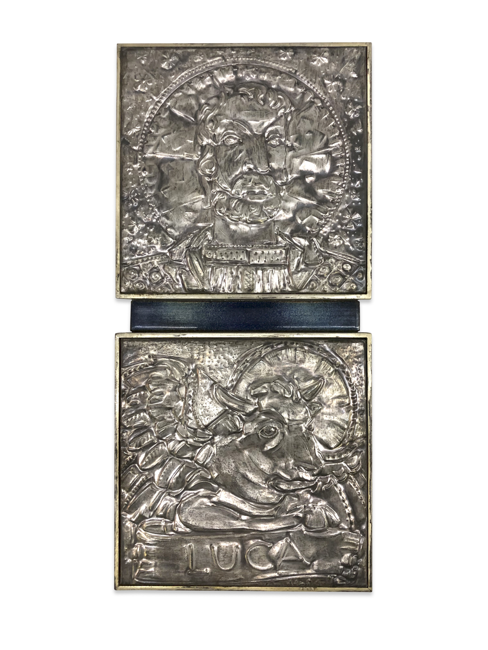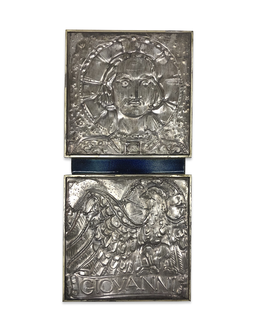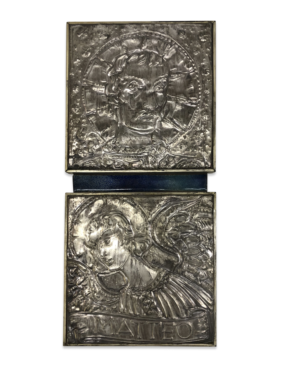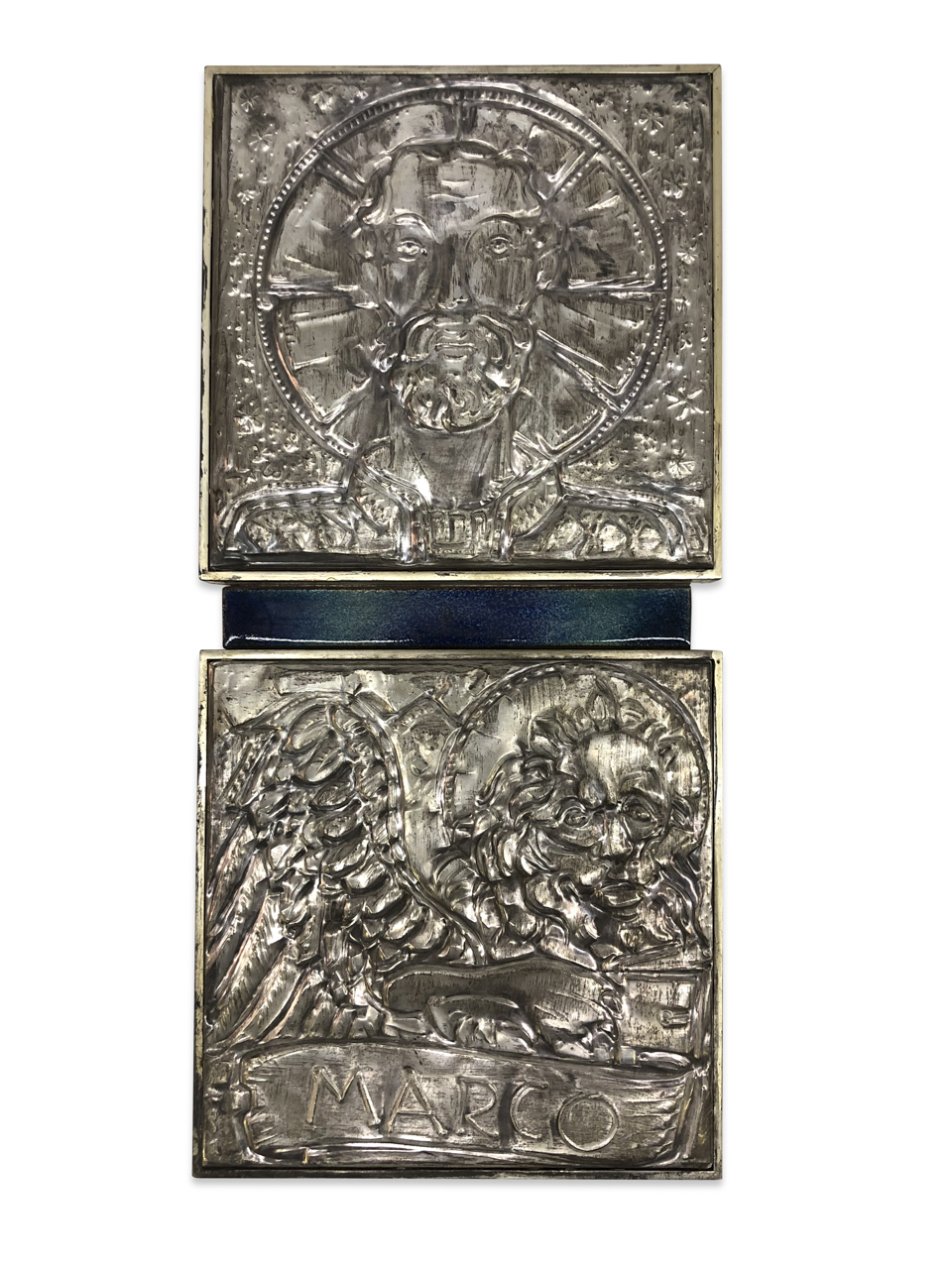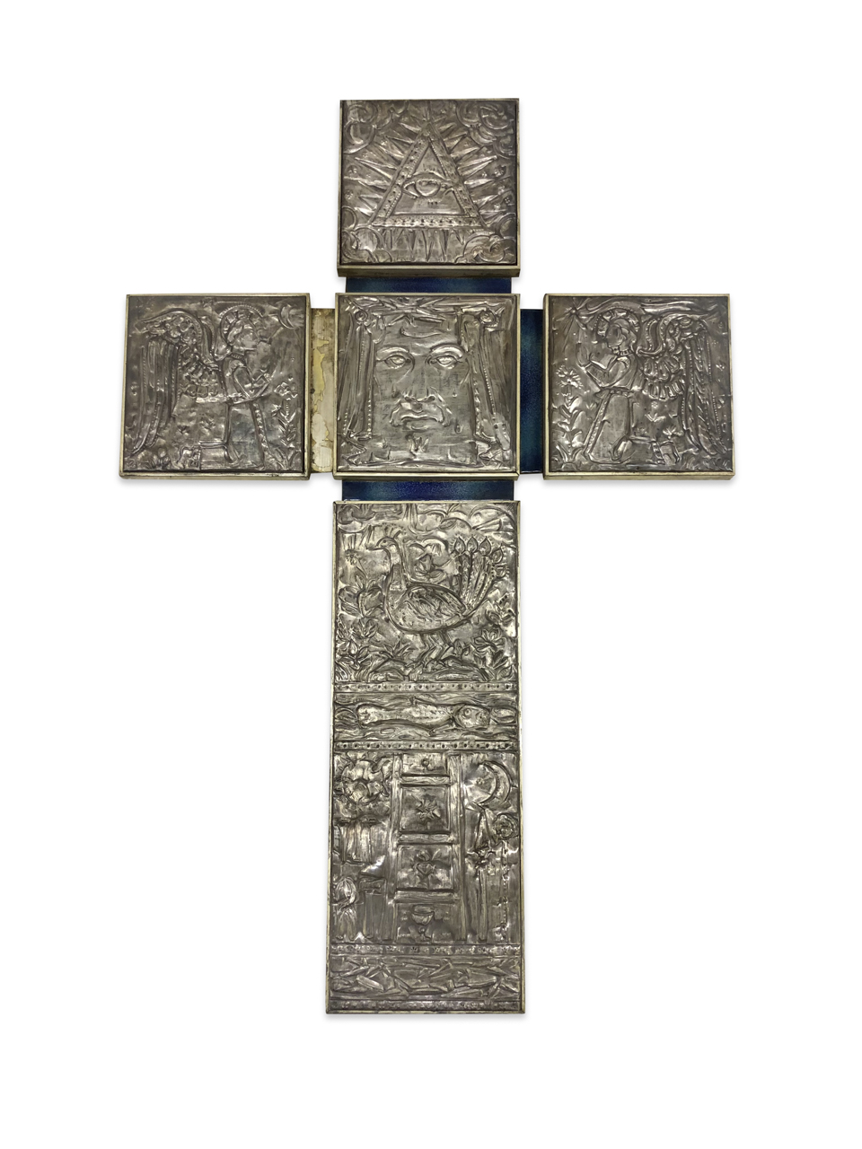L’opera è composta di 13 formelle in rame argentato sbalzato, cinque collegate tra loro a formare una croce e le altre accoppiate a due a due. L’elemento di collegamento tra le diverse parti della croce e tra le formelle accoppiate è un raccordo rettangolare in metallo smaltato di colore azzurro. Nella formella al centro della Croce è raffigurato il Velo della Veronica, in alto l'Occhio della Provvidenza, a sinistra e a destra due Angeli inginocchiati in preghiera, in basso una serie di simboli, tra cui si riconoscono un grosso pesce nel mare, il Sole, la Luna, una scala all’interno della quale sono una stella, una Sacro Cuore, un calice; una figura stante con un mantello con cappuccio. Gli altri otto elementi costituiscono quattro coppie di formelle ciascuna composta da una raffigurazione di un Evangelista sopra e del suo simbolo sotto con il nome scritto su un cartiglio