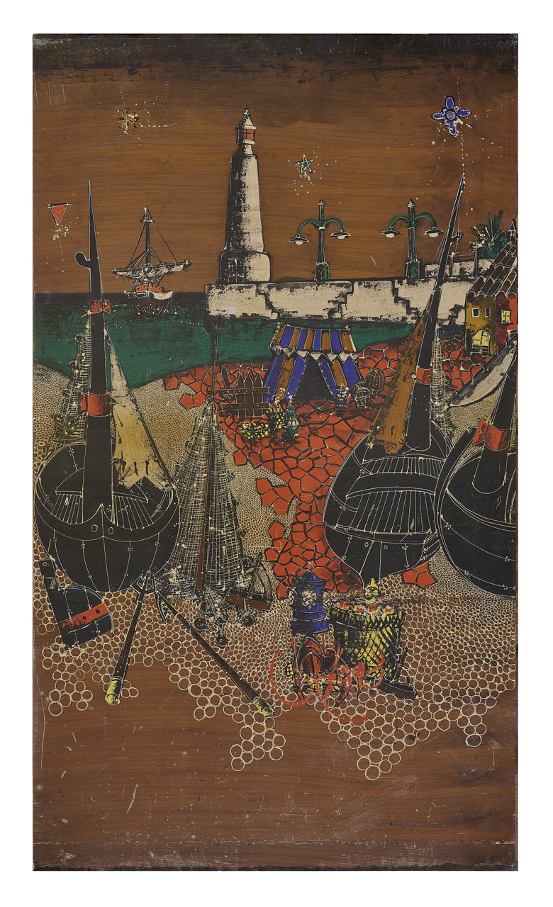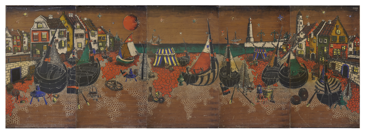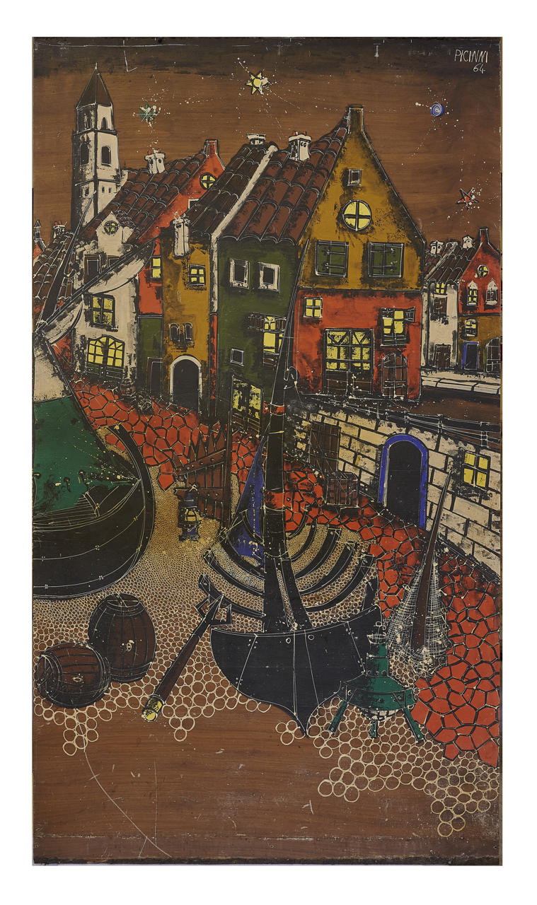 - NOTIZIE STORICO CRITICHE Il dipinto è realizzato su 5 diversi pannelli che erano uniti a formare una parete nella sala da pranzo Monte Bianco, della classe turistica della turbonave Michelangelo. La superficie del laminato è lasciata in vista nel cielo e nella sabbia in primo piano, i colori sono puri, stesi per campiture dai contorni e dalle ombre nere. Gli edifici e le imbarcazioni connotano la veduta come riproducente una ideale città di mare del nord Europa. È questo un tratto caratteristico dei dipinti di Gennaro Picinni, che gli è valso il soprannome di “Fiammingo delle Puglie”. A questa figurazione di derivazione nordica l’artista giunse dopo un esordio nell’astrattismo e l’adesione negli anni Cinquanta ai pittori del Naviglio a Milano. Come le altre opere che decoravano i transatlantici della Società Italia di Navigazione, in seguito alla radiazione delle navi dal servizio passeggeri (l. 684/1974, art. 16) il dipinto è stato assegnato al Ministero dei Beni Culturali