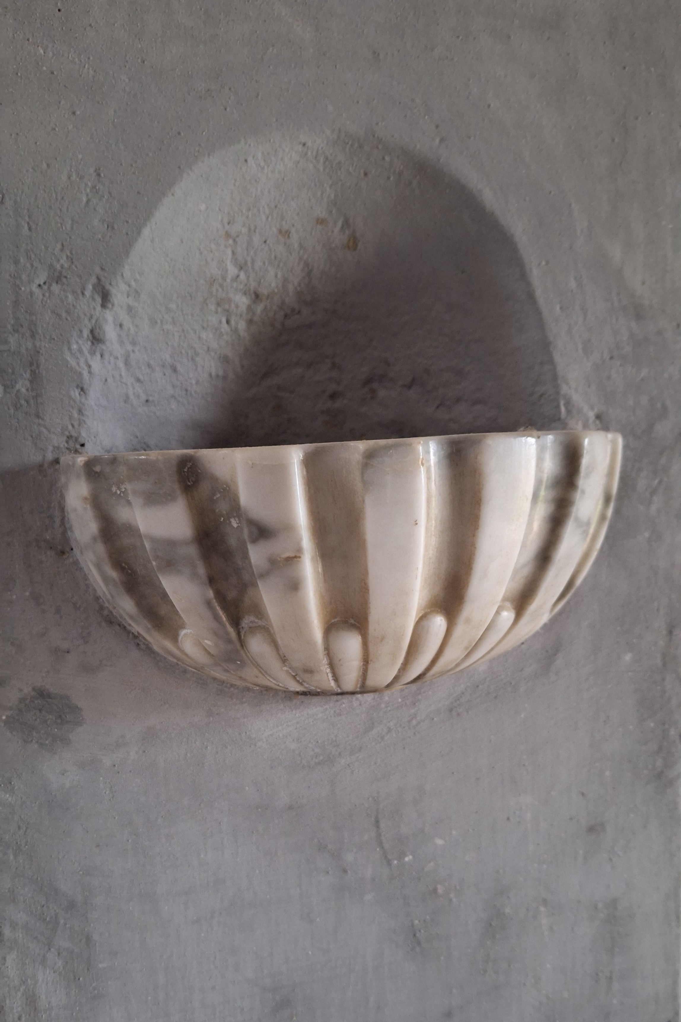 Acquasantiera a muro con vasca a forma di valva di conchiglia baccellata