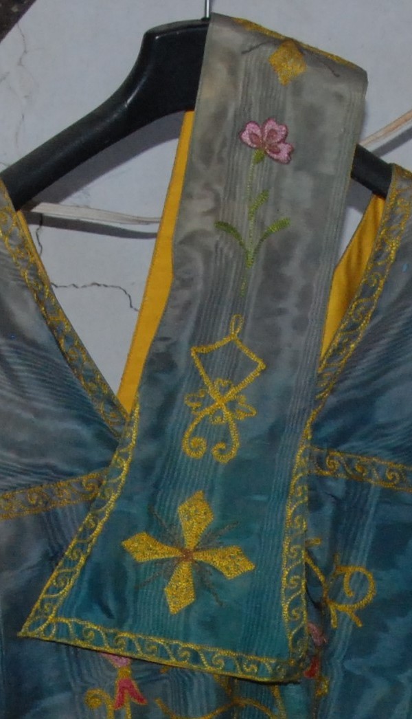 Paramento liturgico composto da una pianeta, una stola e un manipolo. Tessuto azzurro marezzato decorato da girali fioriti ricamati meccanicamente a punto catenella. Sulla croce del lato posteriore della pianeta è raffigurato il monogramma di Gesù Cristo entro uno scomparto circolare delineato da ramoscelli. Fodera in tessuto giallo