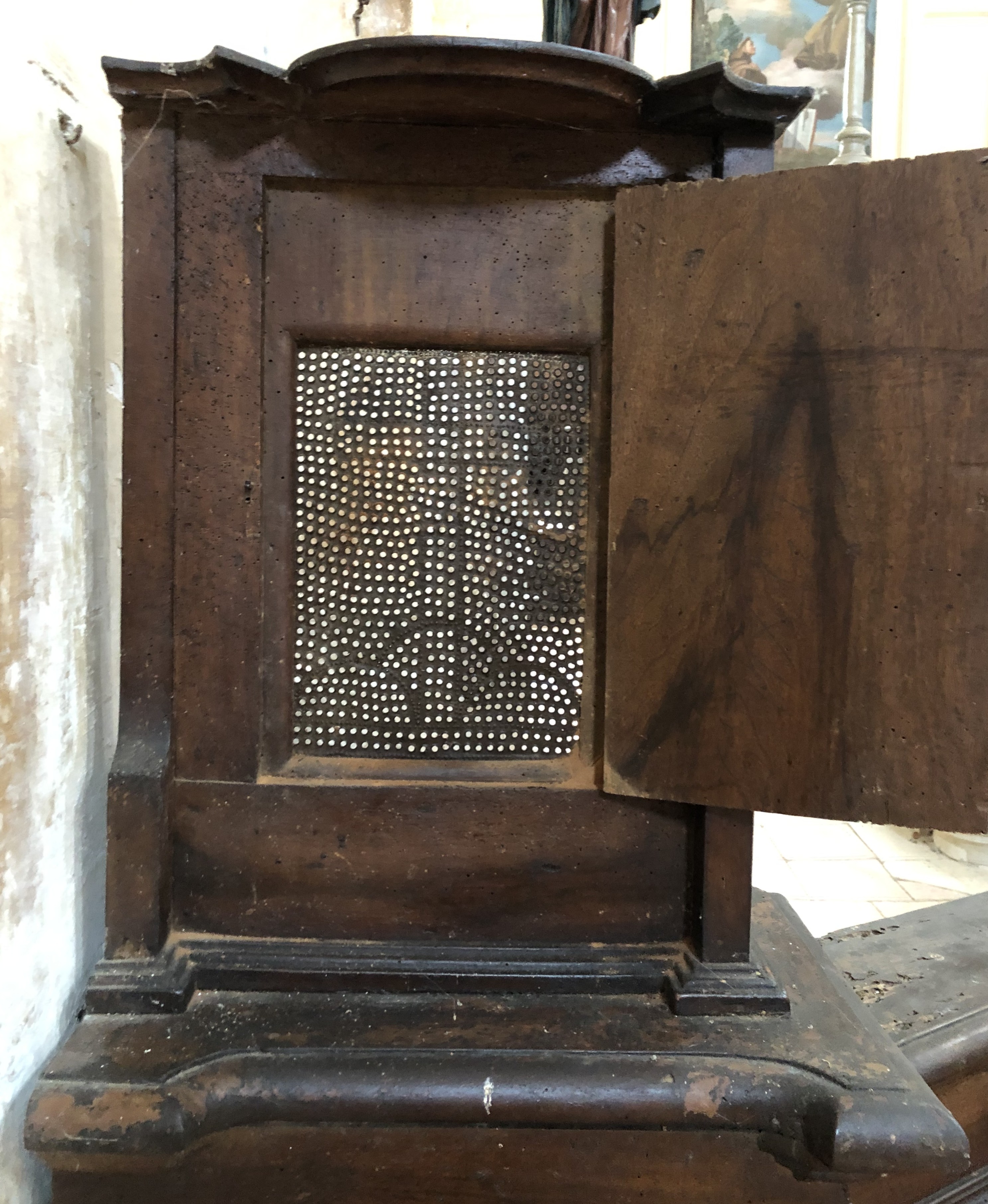 Balaustrata composta da due sezioni angolari formate ciascuna da due scomparti a giorno inglobanti cinque balaustri rivolti alternativamente in alto e in basso; gli scomparti sono compresi tra lesene ornate da specchiature rettangolari. Le estremità verso le pareti terminano in un confessionale con inginocchiatoio con finestrella apicale con grata decorata dalla croce sul Calvario. I piani dello scalino della balaustrata, dell'inginocchiatoio e della finestrella sono a sagoma mistilinea. Le due sezioni sono raccordate da un cancelletto a due ante