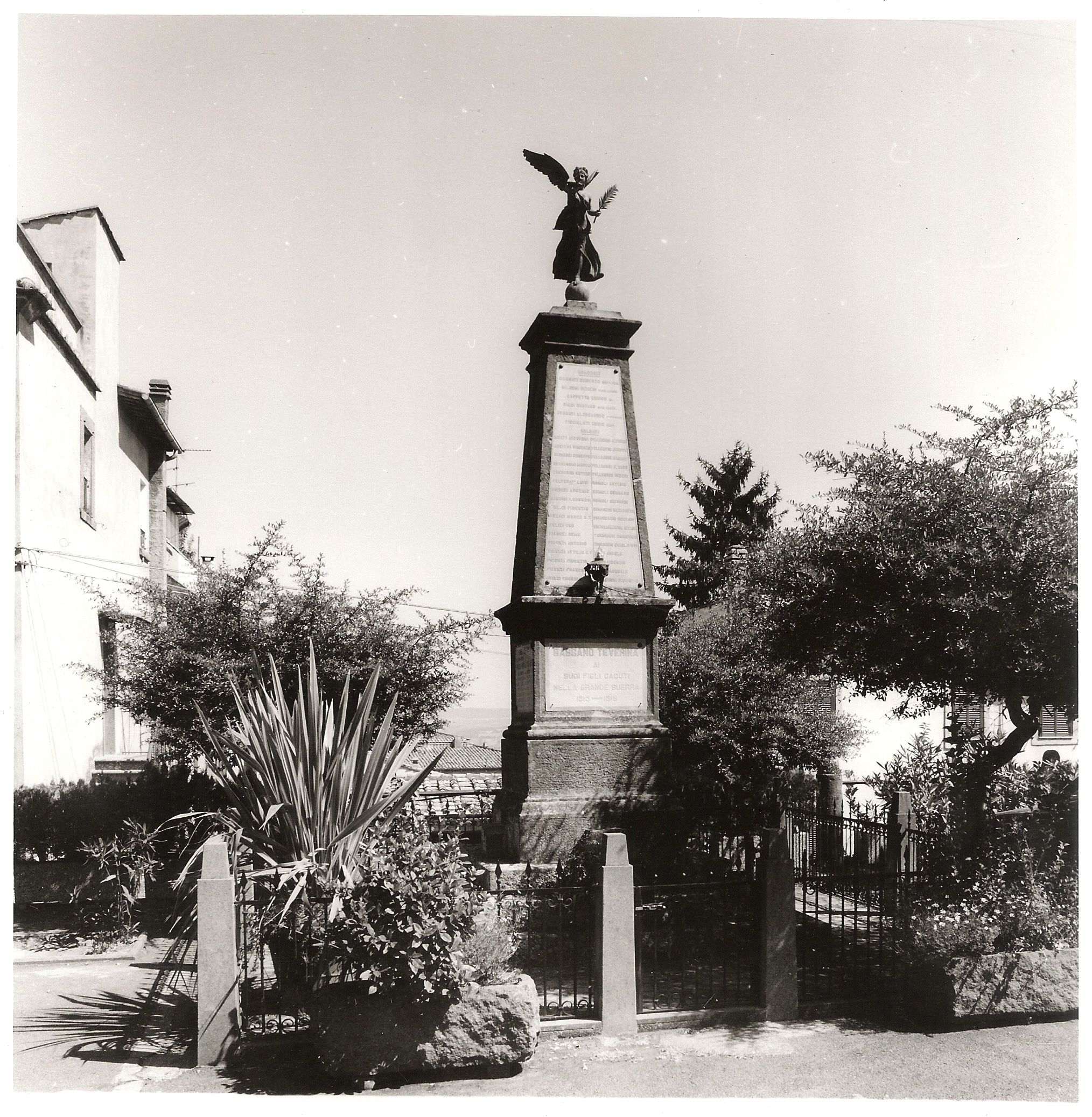 Il Monumento è collocato all'interno di un'aiuola a pianta quadrata con colonnine in peperino e recinzione in ferro. E' costituito da un obelisco a pianta quadrata, circondato da tre gradoni ed elevato su tre zoccoli degradanti, nell'ultimo, di maggior altezza, sono affisse lapidi in marmo con iscrizioni (nel fronte la dedicatoria, a destra nomi dei civili guerra 1915-18, a sinistra guerra 1940-45 e Africa). Su questo poggia un breve obelisco con all'apice piccola Vittoria alata in bronzo su globo, e con il fronte decorato con lapide in marmo ai caduti della guerra 1915-18 (due colonne)