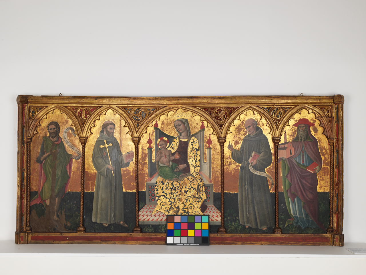 Il polittico è suddiviso in cinque scomparti a fondo oro, racchiusi entro una cornice gotica intagliata e traforata ad archi a sesto acuto polilobati e colonnine tortili. Al centro è collocata la Madonna con il Bambino benedicente, seduta su un trono in marmo ed avvolta in un ricco mantello damascato oro e blu. Il Bambino è coperto con un panno verde, porta al collo una collanina con ciondolo in corallo e regge nella mano destra una melagrana, simbolo cristiano della Resurrezione. Ai lati della Madonna sono due coppie di santi, disposti in piedi su un prato fiorito. Da sinistra a destra: San Giovanni Battista, San Francesco d'Assisi, San Bernardino da Siena e San Girolamo
