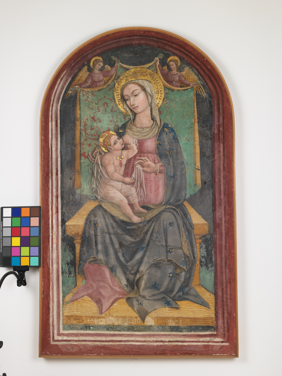 - NOTIZIE STORICO CRITICHE L'affresco proviene dalla chiesa di Sant'Agostino di Teramo, dove è ricordato fino al 1910. Era ancora in loco nel 1942 (Carli 1942, p. 188). Il soggetto veniva tradizionalmente indicato come 'Madonna del Soccorso', ma l'iconografia è propriamente quella della Virgo Lactans, ovvero della 'Madonna del Latte', diffusa a partire dalla metà del XIV secolo, dopo la grande epidemia di peste del 1348, e ricorrente nelle chiese dell'Ordine Agostiniano. L'opera è riferita dalla critica a Giacomo da Campli, pittore attivo tra l'Abruzzo e le Marche nella seconda metà del Quattrocento, oppure ad anonimo teramano affine ai modi del maestro