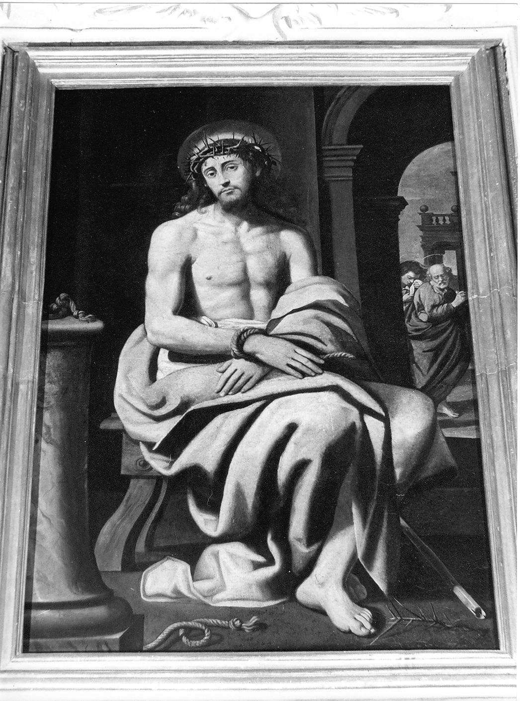 Il Cristo coronato di spine e avvolto in un manto grigio, siede vicino alla colonna, con ai piedi la frusta. Sullo sfondo, sotto un arco, S.Giovanni e S.Giuseppe piangenti