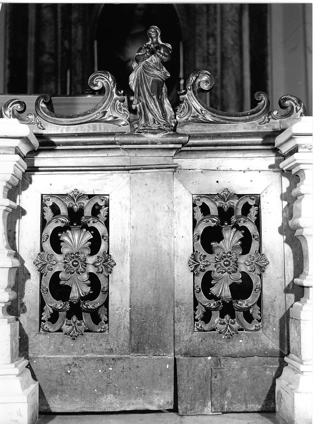Il cancello a due battenti è decorato con motivi nastriformi vegetali e floreali e si chiude sopra con un'immagine dell'Immacolata dello stesso materiale, tra volute, saldata al resto dell'oggetto