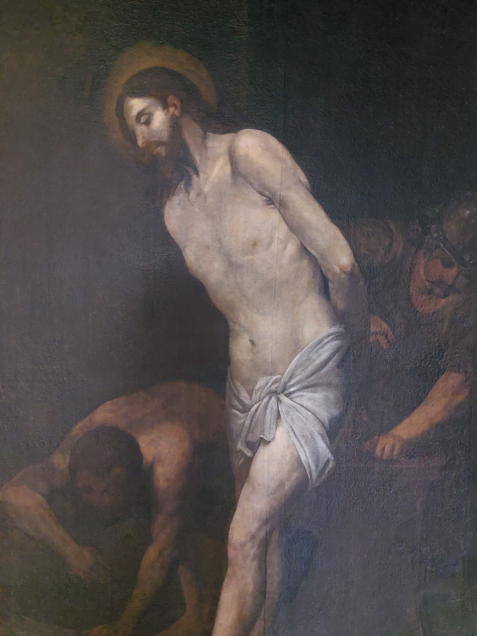 La figura del Cristo, con le mani legate alla colonna, emerge dal fondo scuro illuminata dal fascio di luce. Nella penombra sono due manigoldi: il primo, sul lato sinistro, è chinato intento a legare una corda; il secondo in piedi ha appena immobilizzato il Cristo legandogli entrambi le mani dietro la schiena