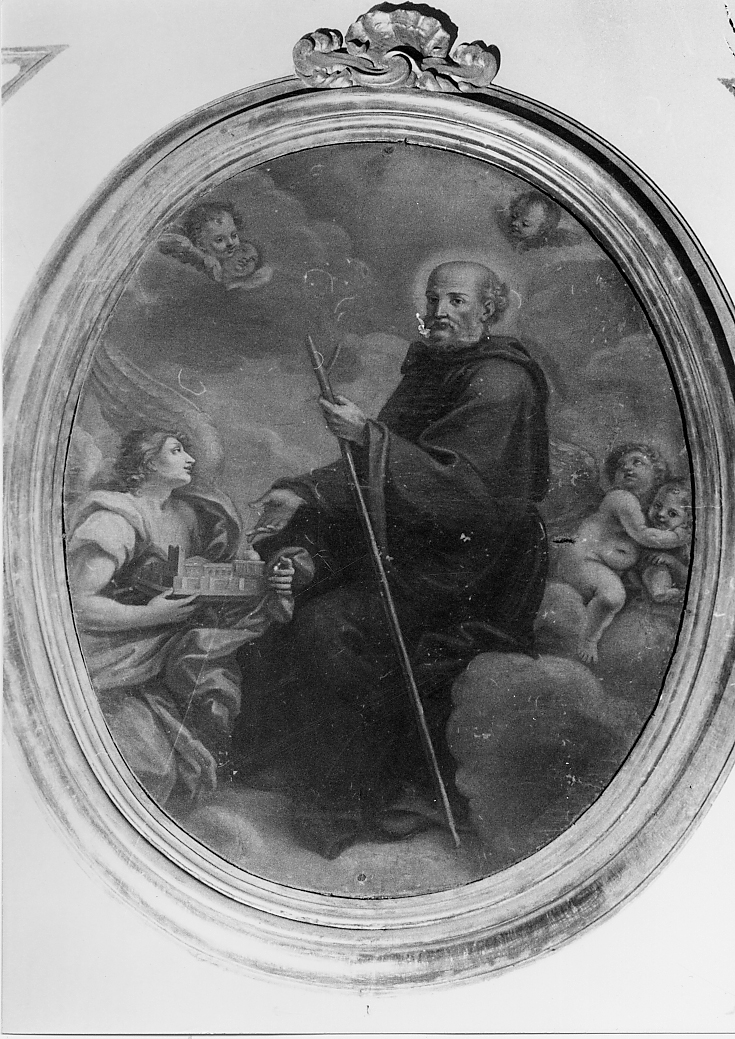 IL SANTO E' RAFFIGURATO TRA LE NUVOLE, SEDUTO E APPOGGIATO A UN BASTINE; DAVANTI A LUI UN ANGELO MOSTRA UN MODELLINO DI CITTA'