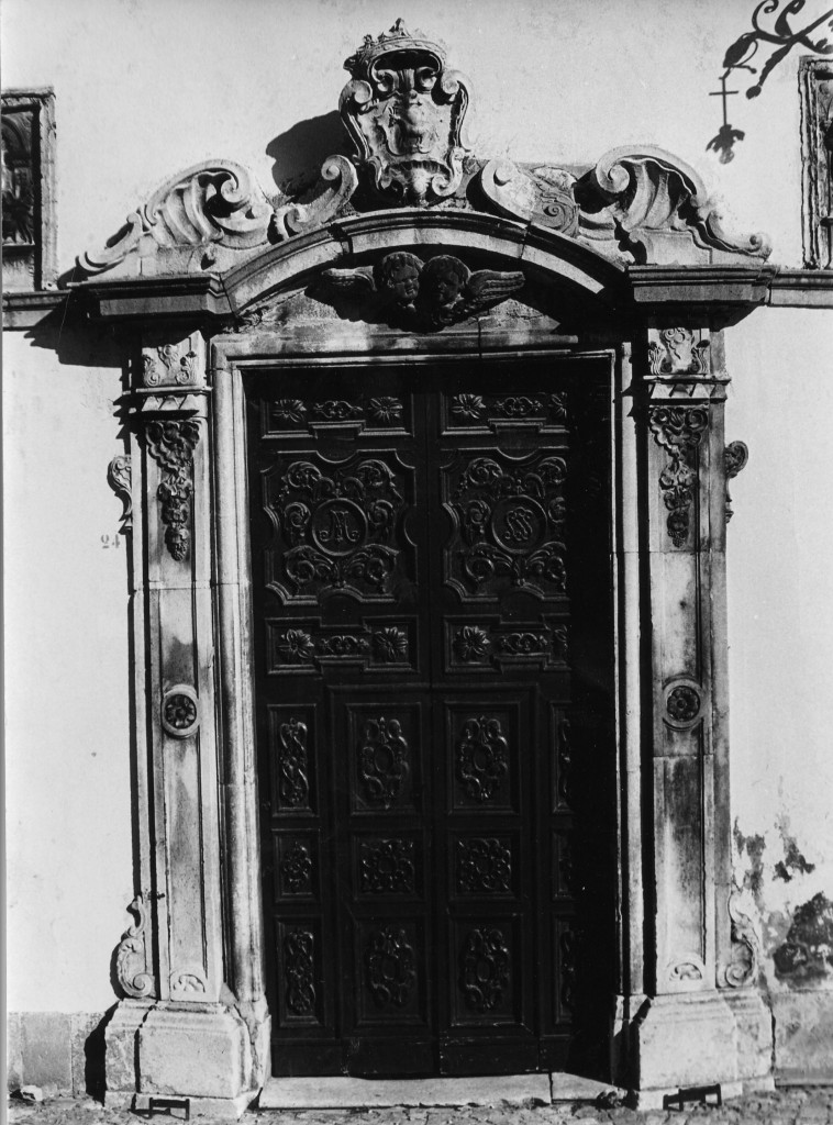 Il portale consta di due pilastri decorati da rosette, volute e rilievi fitomorfi; il timpano ad arco ribassato contiene due cherubini ed è sormontato da ornati a volute e conchigliformi; al culmine stemma nobiliare