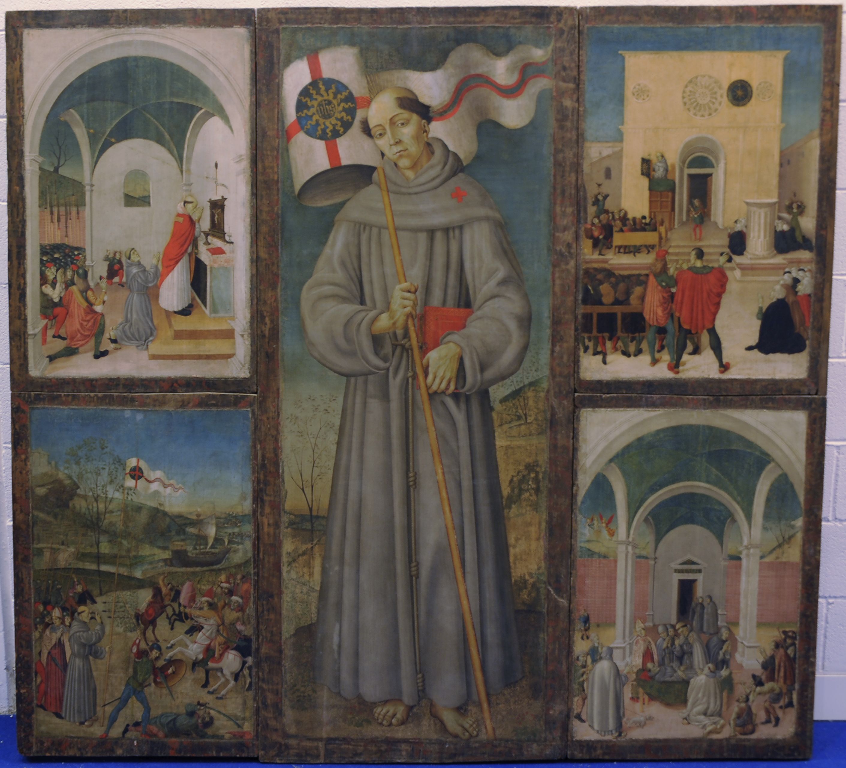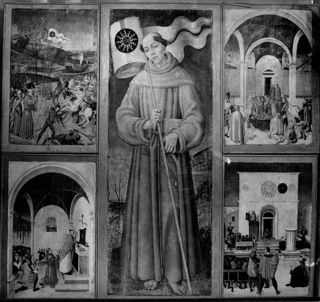 - NOTIZIE STORICO CRITICHE Questo dipinto, formato da cinque pannelli, giunti separatamente al Museo dalla Chiesa aquilana di San Bernardino, solo nel 1948, in occasione della prima mostra di restauri dell'Aquilano, F. Bologna ricompose in modo esatto il polittico, seguendo l'andamento delle linee di suturazione antiche e pervenendo alla fine non solo ad una corretta interpretazione iconografica ma anche e soprattutto ad una più serrata e rispondente articolazione strutturale (Bologna, 1950, p.87). Il critico giungeva così ad individuare l'autore del polittico in un ignoto maestro denominato convenzionalmente Maestro delle Storie di San Giovanni da Capestrano, autore anche dell'altra tavola con le "Stimmate di San Francesco". Delineata così precisamente la personalità artistica del pittore, veniva a cadere l'identificazione proposta precedentemente dal Chini, sulla base di documentazione d'archivio male interpretata, con Sebastiano di Cola da Casentino. Il Maestro di San Giovanni da Capestrano è un pittore di formazione eterogenea in quanto, accanto a influenze iberiche -fiamminghe-borgognone non mancano nelle sue opere riferimenti padano-ferraresi. R. Cannatà (1981), sulla base di analogie stilistiche che vanno dalla stessa preferenza per le masse squadrate dai rigidi contorni alla medesima volontà di aderire a motivi idealistico espressivi (Cannatà, 1981, p. 53), suggeriva l'identificazione del Maestro di San Giovanni da Capestrano con Paolo Aquilano, l'autore che firmava una scultura lignea di San Francesco in Santa Maria della Pace a Fontecchio (AQ). R. Rusconi (1987) si è occupato dell’analisi iconografica del polittico (dalla “Messa di Peterwardein” alla “Battaglia di Belgrado”, passando per gli episodi sopracitati della “Predica all’Aquila” e della “Morte del frate”). Lo studioso ha individuato le singole scene del dipinto basandosi sulle fonti agiografiche a disposizione. Ha sottolineato inoltre la condizione di beato del frate al momento della realizzazione dell'opera, in contrasto con l'intitolazione tradizionale del dipinto. In seguito il Bologna (1993; 2009) ha proposto l'identificazione del Maestro di San Giovanni da Capestrano con Giovanni di Bartolomeo dall'Aquila, seguito anche da R. Torlontano (2011). L. Pezzuto (2010) ha invece avanzato l'ipotesi dell'identificazione dell'autore con Anton Battista di Ciancia