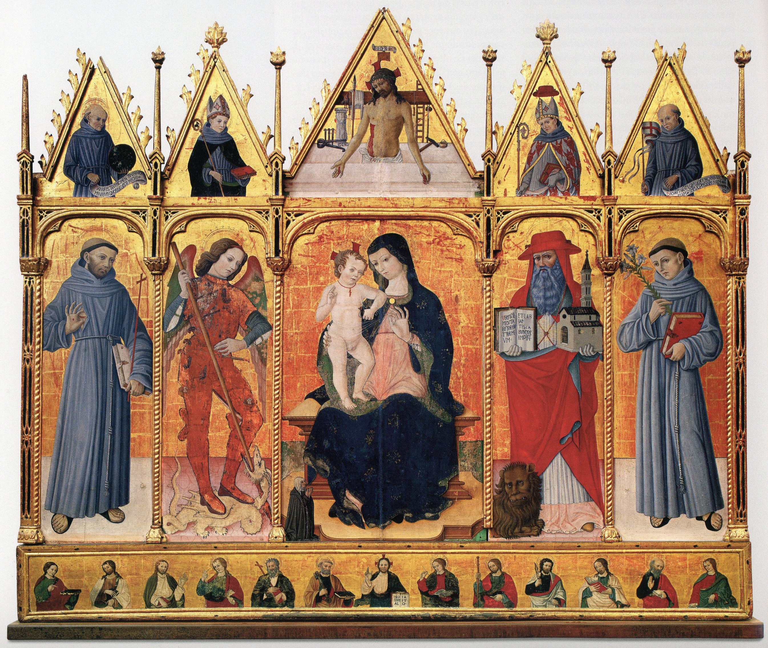 - NOTIZIE STORICO CRITICHE Il polittico, descritto dal Leosini nel 1848 quale opera appartenente al Convento di Sant'Angelo d'Ocre, si ritrova nell'inventario del Municipio aquilano redatto a mano nel 1908 , ivi trasportato dopo la soppressione degli Ordini Minori nel 1865 ed il conseguente trasferimento dei Beni al Comune. Fu attribuito concordemente del Van Marle (1924, vol. XV, p. 103), dal Serra ( 1929, p. 104) dal Berenson 1932), dalla Gabbrielli (1934, p. 43), più per tradizione che per conferma stilistica a Cola dell'Amatrice. Ma nel 1936 già il Borenius, confrontando il polittico di Harewood, arrivato in Inghilterra nel 1916 proveniente dalla zona di Chieti, con quest'opera ed un'altra proveniente dal Convento di San Giovanni da Capestrano, ora nello stesso Museo, li riteneva tutti ugualmente lontani dalla maniera di Cola nelle sue opere certe e ne scorgeva invece affinità con le opere di Pietro Alamanno. Successivamente il Chini(1934, p. 23) ed il Carli (1942, p. 29) individuavano l'autore nell'abruzzese Giacomo da Campli, in un tentativo di ricostruzione della personalità pittorica di questo artista, datando l'opera verso la fine del XV sec. F. Bologna ( 1948), ricostruito un piccolo gruppo di opere tolte al catalogo di Giacomo da Campli, le riferiva ad un pittore che denominava provvisoriamente "Maestro dei Polittici Crivelleschi", pittore dalla personalità ben precisa, di scuola crivellesca, ma di un crivellismo vissuto isolatamente lontano dalle Marche, lungo la vallata aquilana.Accettata dalla critica successiva,( Berenson 1968; Moretti 1968; Torlontano 1987; Settimi 1998) tale attribuzione è stata rinnovata di recente dallo stesso studioso con nuove argomentazioni ( Bologna 2009). L.Arbace( 2011)nel riesaminare la questione attributiva, ripropone il nome di Giacomo da Campli anche sulla scorta di un contributo di E. Ludovici (2003) pubblicato nella rivista " Arte cristiana" . Nell'ambito delle argomentazioni proposte dalla Ludovici, appare di particolare interesse l'attribuzione a Giacomo da Campli degli affreschi nella chiesa di Santa Giusta di Bazzano a l'Aquila raffiguranti "San Giorgio che sconfigge il drago" e "Sant'Antonio Abate" con il committente da identificarsi con ogni probabilità con il giureconsulto Nicola Porcinari, nominato da re Ferdinando Commissario Generale contro i delinquenti di tutto il Regno e Gran Giustiziere del Regno nel 1475. Del resto se il tema degli affreschi appare coerente con le cariche del nobile abruzzese, la stessa data del 1475 appare rafforzare il ruolo di tale opera, come l'anello di congiunzione tra le opere giovanili, in particolar modo il polittico di Campli, databile verso il 1465-70, e il gruppo "aquilano". Ludovici affronta anche il problema della scansione cronologica, proponendo una successione del tutto condivisibile: l'attività di Giacomo da Campli, e anche quella del suo omologo "Maestro dei Polittici Crivelleschi", ricostruita da Ferdinando Bologna, si conclude con il dipinto raffigurante "La Madonna del Suffragio" proveniente dalla chiesa di San Francesco di Chieti, oggi custodito presso il Museo d'Arte Costantino Barbella, opera che può senz'altro collocarsi alla fine dell'intero percorso, anche in funzione della novità del paesaggio roccioso in sostituzione del fondo oro. Nella suddetta opera, come nel polittico di Sant'Angelo d'Ocre, il Bambino Gesù viene raffigurato in piedi, circondato da un'aureola crociata in rosso, nudo e benedicente, l'unica differenza sostanziale il rametto di corallo che il Bambino Gesù reca al collo (nel polittico). Ciò potrebbe sottintendere la conoscenza dell'analoga soluzione adottata da Piero della Francesca nella "Madonna di Senigallia", forse sulla base della trasmissione orale della notizia ma anche una specifica richiesta da parte del committenza