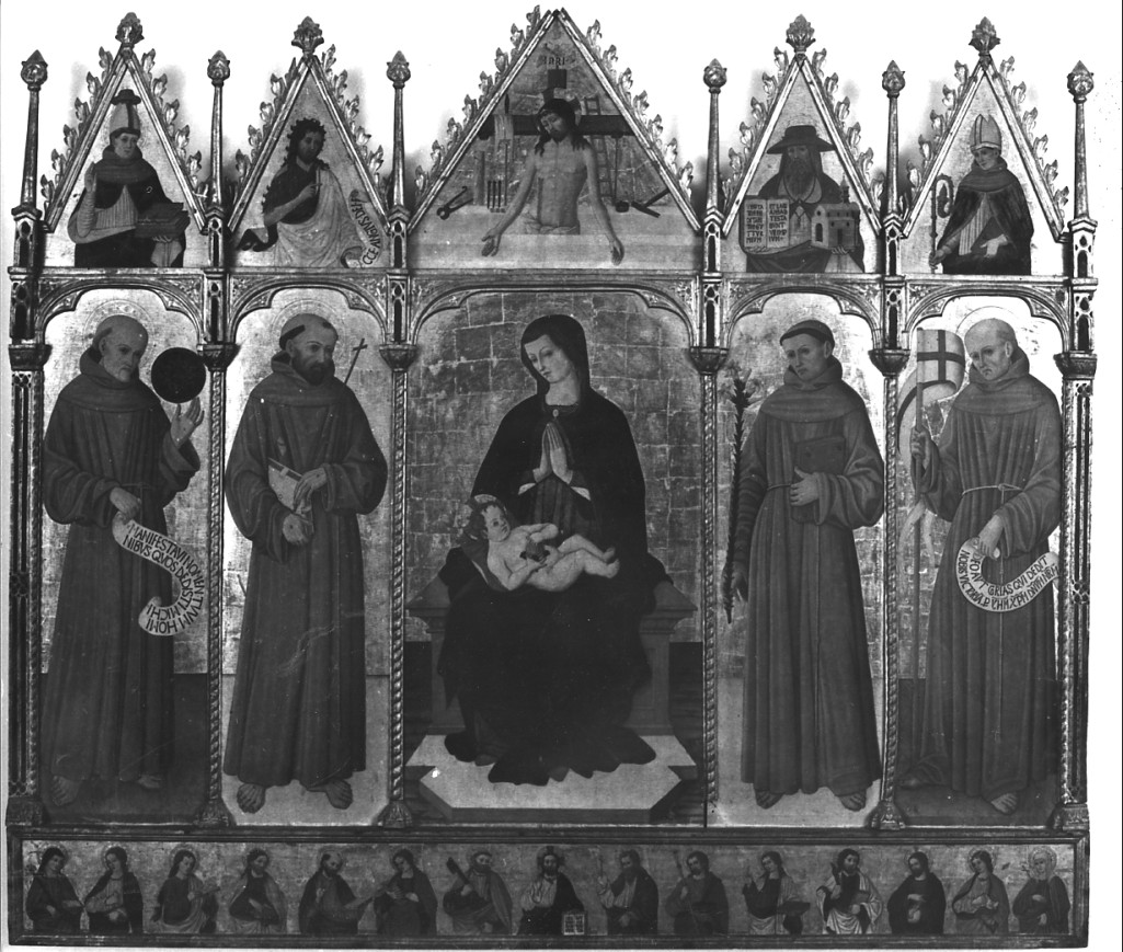 - NOTIZIE STORICO CRITICHE Il polittico fu attribuito concordemente, più per tradizione che per un'analisi stilistica, a Cola dell'Amatrice dal Van Marle (1924, vol. XV, p. 103), dal Serra, (1929, p. 104) dal Berenson (1932, pp. 250-251) dalla Gabbrielli (1934, p. 43). Ma nel 1936 già il Borenius (1936, p. 12), confrontando il polittico di Harewood, arrivato in Inghilterra nel 1916 dalla zona di Chieti, con quest'opera e con un'altra proveniente dal Convento di Sant'Angelo d'Ocre, ora nel Museo Nazionale d'Abruzzo (cfr. scheda n. 16), li riteneva tutti ugualmente lontani dalla maniera di Cola delle sue opere certe, e ne scorgeva invece affinità con le opere di Pietro Alemanno. Successivamente il Chini (1934, p. 23) ed il Carli (1942, p. 29) credevano di individuare l'autore nell'abruzzese Giacomo da Campli, in un tentativo di ricostruzione della personalità pittorica di questo pittore, datando l'opera verso la fine del sec. XV. F. Bologna, finalmente, ricostruito un piccolo gruppo di opere molto affini per tipologia e stile, "gruppo di rara coerenza, cronologicamente imperniato sul 1489 del polittico di Tocco, fra i più tardi della serie"(1950, p. 369), dopo averle tolte al catalogo di Giacomo da Campli, le riferiva ad un artista che denominava provvisoriamente "Maestro dei Polittici crivelleschi". pittore dalla personalità ben precisa, di scuola crivellesca, ma di un crivellismo vissuto separatamente e lontano dalle Marche, lungo la vallata aquilana. La Arbace (2011) ripropone l'ipotesi Giacomo da Campli, soprattutto dopo le aggiunte al corpus dell'artista effettuate dalla Ludovici (2003), che nota come il maestro si sia liberato nel tempo delle asprezze giovanili, per assumere un'intonazione "severa e razionale" che contraddistingue le opere della maturità. Alla componente marchigiano- veneta, arricchita da Antonio e Bartolomeo Vivarini, si aggiungerebbe, sempre secondo la Ludovici, l'influenza di Antonio Aquili, detto Antoniazzo Romano, già notata dal Van Marle (1934, p. 240) per le opere, in quel tempo assegnate a Cola dell'Amatrice. La datazione dell'opera è da ritenersi antecedente al polittico di Sant'Angelo di Ocre; quest'ultimo, infatti, è da ritenersi secondo la Arbace (2011, p. 59) "modello del primo in seconda battuta" con alcune modifiche. Il termine certo è il 1482, anno nel quale viene santificato Bonaventura da Bagnorea, figura presente in entrambi i polittici. Qui, il Santo indossa un piviale azzurro, regge tre volumi invece che uno e benedice con la mano destra invece di reggere il pastorale, attributo del Santo, che era vescovo di Albano. Secondo la Arbace (2011), questa difformità può essere spiegata "con un inserimento in extremis in sostituzione di un altro santo francescano, appena giunta la notizia della santificazione"