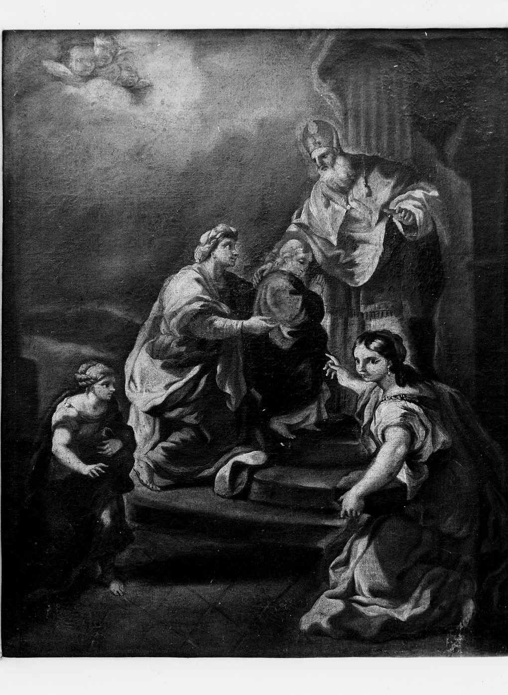 - NOTIZIE STORICO CRITICHE Il dipinto, di qualità non particolarmente elevata, rappresenta la Presentazione di MAria al Tempio; è senza dubbio opera di ambiente napoletano che risente in principal modo della pittura del Solimena. Lo rivela sia la strutturazione spaziale del dipinto, con una diagonale molto ardita, sia il particolare uso del chiaroscuro tipico del maestro napoletano. Una certa sommarietà e velocità nella esecuzione dell'opera potrebbe fare pensare ad un bozzetto ma il contrasto tra la qualità della struttura spaziale e la resa effettiva della pittura rendono più probabile l'ipotesi di una copia. Il dipinto è comunque da attribuire ad un ignoto l'ipotesi di una copia. Il dipinto è comunque da attribuire ad un ignoto artista della prima metà del XVIII secolo. (Sul Solimena si veda: F. Bologna, Francesco Solimena, Napoli, 1958; per l'ambiente napoletano della fien del '600 e gli inizi del '700: Civiltà del '700 a Napoli, Firenze, 1980, Civiltà del Seicento a Napoli, Napoli, 1984, con ampia bibliografia)