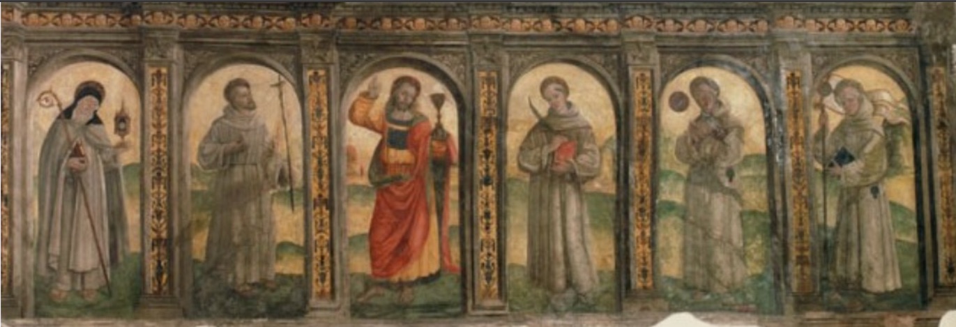 Santa Chiara, San Francesco, Cristo dell'Eucarestia, Sant'Antonio da Padova, San Bernardino da Siena, San Giovanni da Capestrano. Cristo