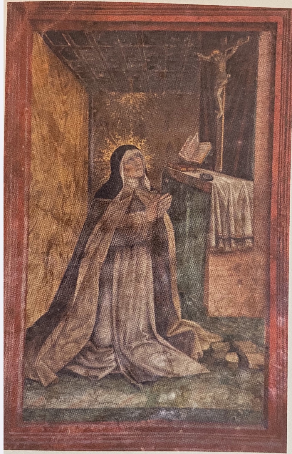 - NOTIZIE STORICO CRITICHE Il pannello con la raffigurazione di Antonia in ginocchio sembra essere stato aggiunto dopo e al di sopra del progetto pittorico attribuito a Francesco da Montereale. Non troppo tempo dovette passare tra la stesura del ciclo con la Crocifissione e Santi e la realizzazione del pannello, inserita forse in occasione della creazione del monumentale sarcofago della beata proprio al di sotto