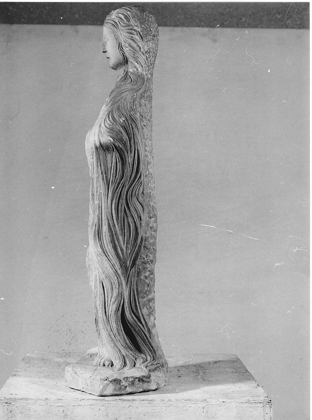 - NOTIZIE STORICO CRITICHE La statuetta raffigura S. Maria Egiziaca secondo Serra (L. Serra, 1912, p .25), mentre secondo Moretti (M. Moretti, 1968, p . 324), la Maddalena. Effettivamente è impossibile distinguere le due sante quando - come in questo caso - sono raffigurate come penitenti, con i lunghi capelli che ricoprono il corpo e senza alcun ulteriore attributo. L'opera, appartenente alla decorazione del portale centrale della chiesa di S. Maria di Collemaggio, si rivela pienamente quattrocentesca per la saldezza dei volumi evidente nel corpo massiccio anche se movimentato dall'ondeggiare dei capelli; anche il viso è squadrato ma non è privo di una certa animazione data dagli occhi e dalla bocca socchiusi