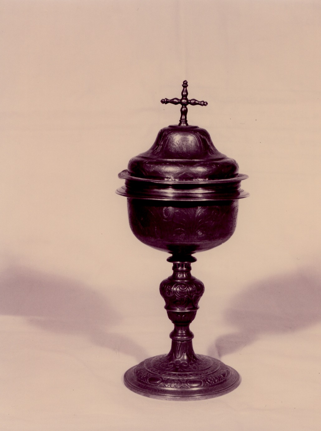 Pisside con piede circolare ad ovuli e motivi vegetali, che si ripetono sul fusto sagomato e sul nodo piriforme. Sulla coppa e sul coperchio sono incisi i simboli della Passione tra inusuali motivi vegetali. Una crocetta orna la sommità