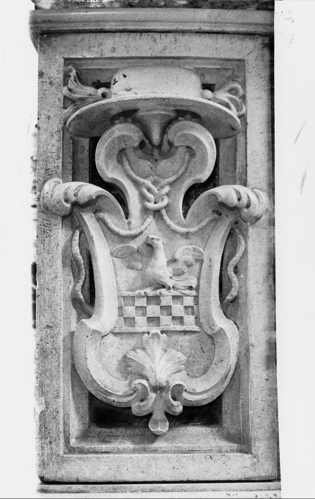 La balaustra mistilinea e aperta al centro è costituita da uno zoccolo modanato su cui si alternano pilastri, colonne e semicolonne. Sulle facce dei due pilastri centrali sono 2 stemmi, quello di sinistra con monogramma e quello di destra con lo scudo sormontato da un cappello da abate, presenta nel centro un'aquila che con le ali aperte posa su una scacchiera. Superiormente una cornice modanata chiude la balaustra