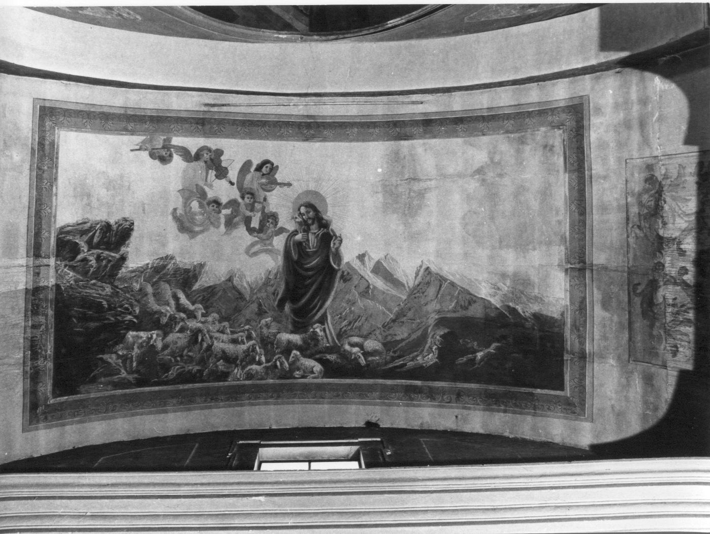 Al centro del dipinto è Gesù pastore attorniato dal suo gregge. Sullo sfondo è una catena di montagne. In alto è una gloria di Angeli musicanti