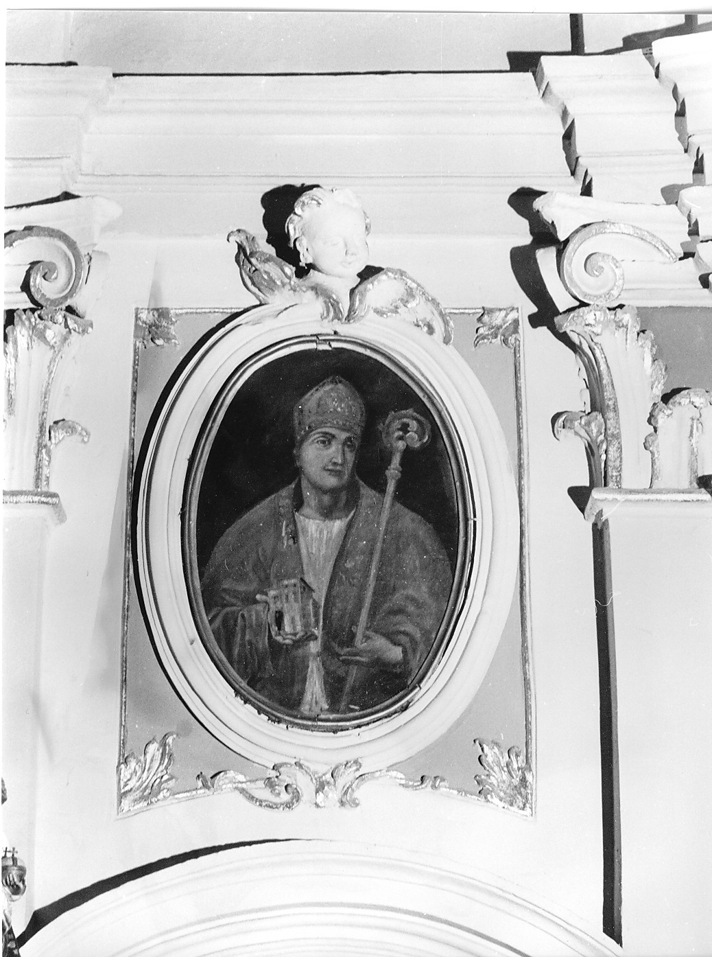 Entro un ovale è raffigurato il Santo, in abiti vescovili mentre mostra il modellino della città dell'Aquila
