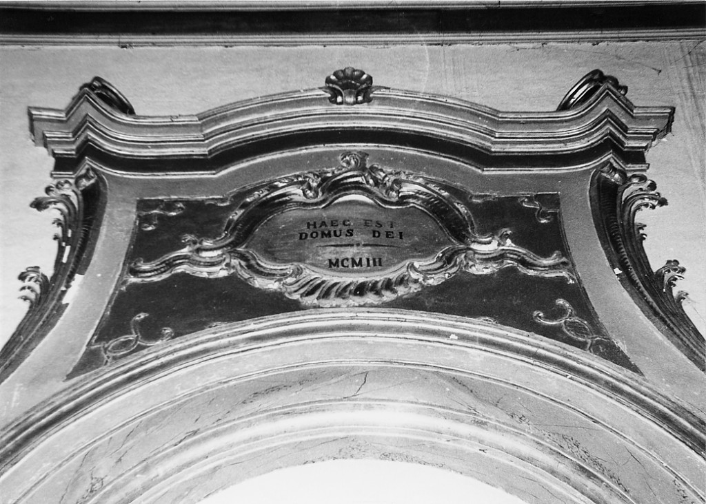 - NOTIZIE STORICO CRITICHE L'iscrizione fu ridipinta in occasione dei restauri dell'estate del 1903 ad opera di Antonio Pavona, come riportato dalla lapide nella navata sinistra (c-c. 13/00057395) e a quella data essa si riferisce; faceva parte della decorazione originaria della meta' del 700