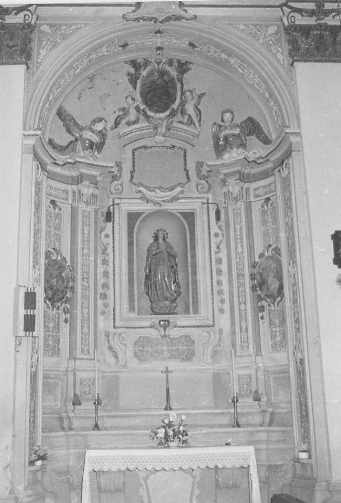 Due paraste su alta base sostengono cornici spezzate poste ai lati di un coronamento mistilineo. Ai lati quattro lesene specchiate ; al centro una nicchia sostenuta da volute a libretto