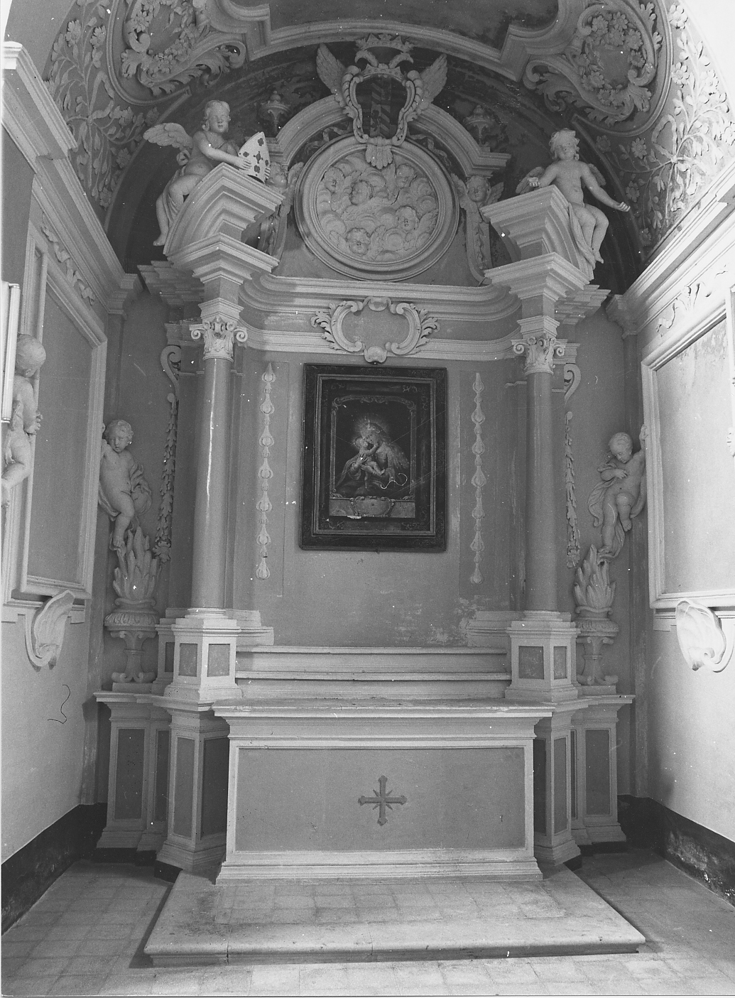 ALTARE A BLOCCO CON PREDELLA; AL CENTRO DEL PALIOTTO CROCE TRILOBATA IN STUCCO; SULLA MENSA DOPPIO GRADO. IL DOSSALE E' COSTRUITO DA DUE COLONNE CON FUSTO LISCIO E CAPITELLO COMPOSITO. AL CENTRO DEL FREGIO UN CARTIGLIO PRIVO DI ISCRIZIONI; AI LATI DEL FRONTONE SPEZZATO DUE ANGELI A TUTTO TONDO (QUELLO DI SINISTRA REGGE CON LE MANI LA MITRA). SULLA PARETE DI FONDO MEDAGLIONE CON TESTINE ALATE IN BASSORILIEVO SORMONTATO DA UN FASTIGIO CURVILINEO CON VASI ACROTERALI E STREMMA IN STUCCO DIPINTO SULLE TONALITA' DELL'OCRA DIVISE ORIZZONTALMENTE IN DUE E QUINDI VERTICALMENTE IN QUATTRO; VI SI ALTERNANO A BANDE ORIZZONTALI E VERTICALI LEONI RAMPANTIE STELLE