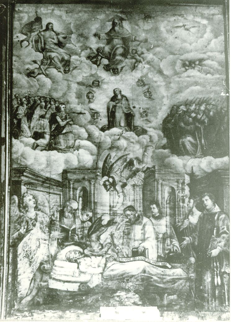 Il dipinto è collocato nella nicchia dell'altare maggiore. La composizione, molto affollata, rappresenta, in alto la Santa Triade, al centro la Madonna circondata da Apostoli e Santi, in basso un moribondo al quale un sacerdote raccomanda l'anima