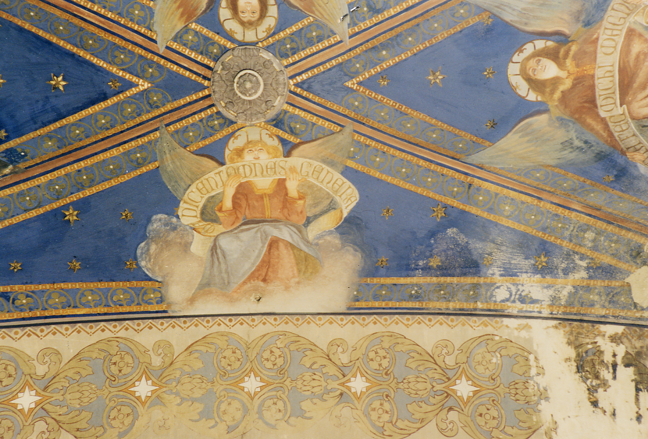 - ISCRIZIONI sul cartiglio - (BEATAM) ME DICENT OMNES (GENERATIONES) - caratteri gotici - a pennello - latino