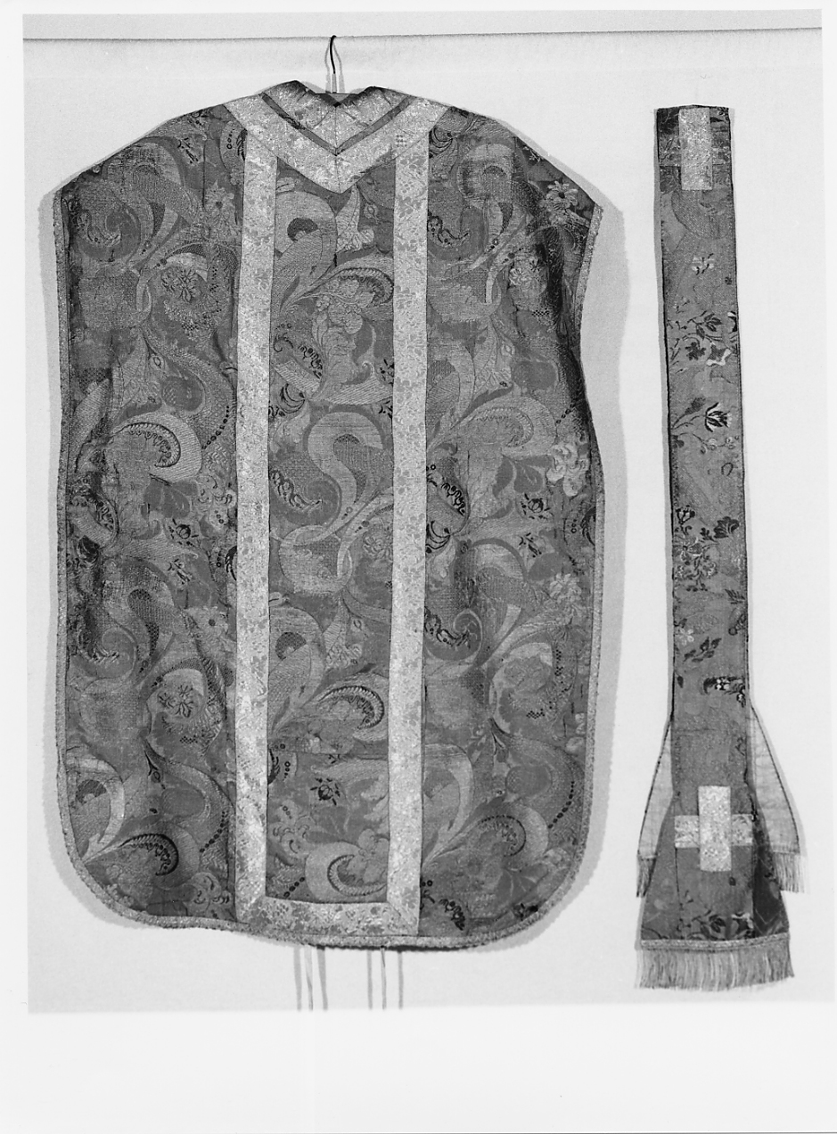 Il parato è guarnito con galloni del sec. XVIII, eseguiti in argento filato e seta avorio, decorati con motivi fitomorfi stilizzati. La fodera è in tela di lino avorio