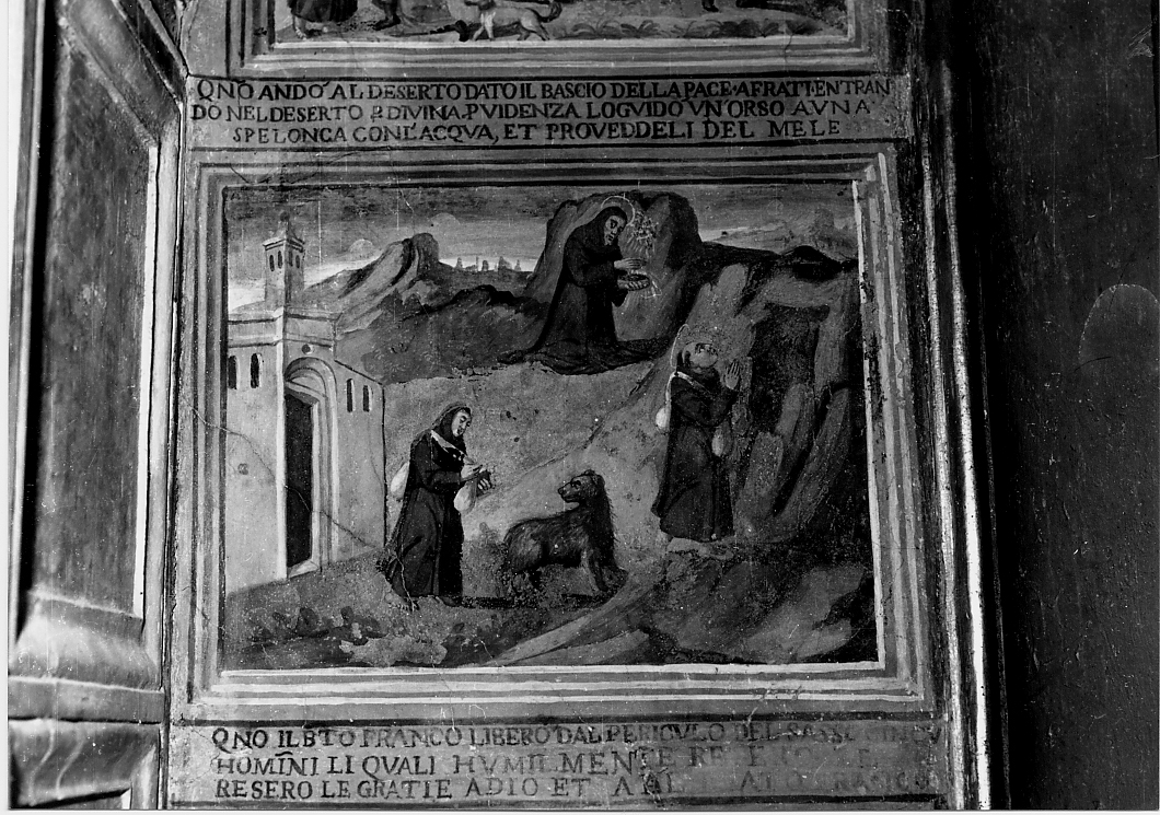 - ISCRIZIONI a sinistra - QNO ANDO' AL DESERTO DATO IL BASCIO DELLA PACE. A FRATI - ENTRANDO NEL DESERTO. DIVINA PVIDENZA LO GVIDO UN ORSO A UNA SPELONCA CON L'ACQUA , ET PROVVEDELI DEL MELE - lettere capitali - a pennello -