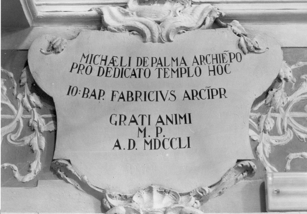 - ISCRIZIONI tutto campo - MICHAELI DE PALMA ARCHIEPO/ PRO DEDICATO TEMPLO HOC/ IO. BAP. FABRICIUS ARCIPR/ GRATI ANIMI/ M. P./ A. D./ MDCCLI - lettere capitali -