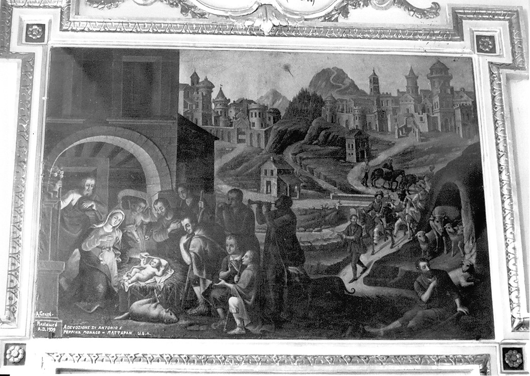 Inserito in una cornice in stucco. Personaggi: Madonna; Gesù Bambino; San Giuseppe. Figure: Re magi; pastori. Animali: cani; cavalli; bovini; pecore; asino. Architetture