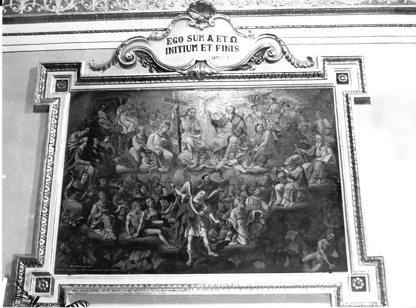 E' inserito in una cornice in stucco. Personaggi: Dio Padre; Gesù Cristo; Madonna. Figure: Santi; Profeti; anime del purgatorio; dannati; demoni