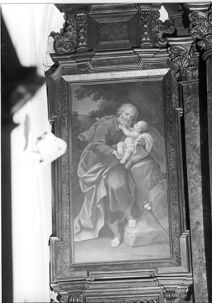 San Giuseppe, avvolto in un ampio manto e con il piede sinistro poggiato su una roccia, ha in braccio il Bambino
