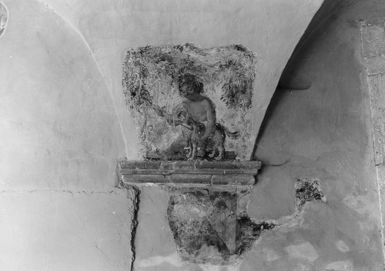 - NOTIZIE STORICO CRITICHE Il dipinto raffigura il cane bianco e nero con una fiaccola in bocca , simbolo della fede. Quasi certamente al di sotto era affrescata la figura di Pietro Ispano da Lisbona medico e teologo, papa per otto mesi nel 1276 con il nome di Giovanni XXI