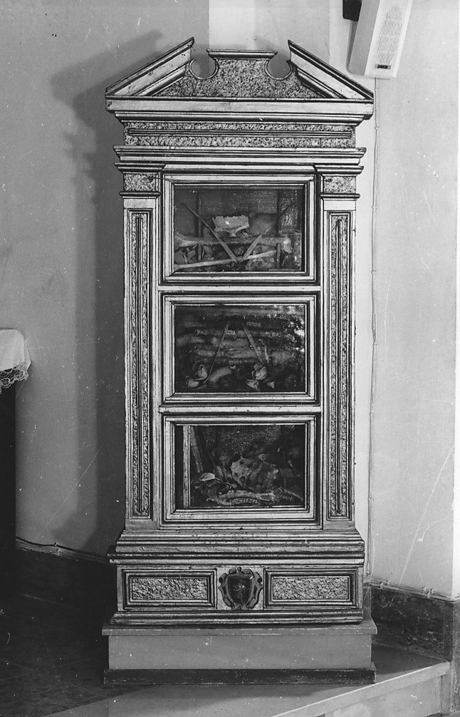 Struttura a sezione quadrilatera. Alzata con fronte decorato con motivi architettonici che inquadrano tre aperture a vetro