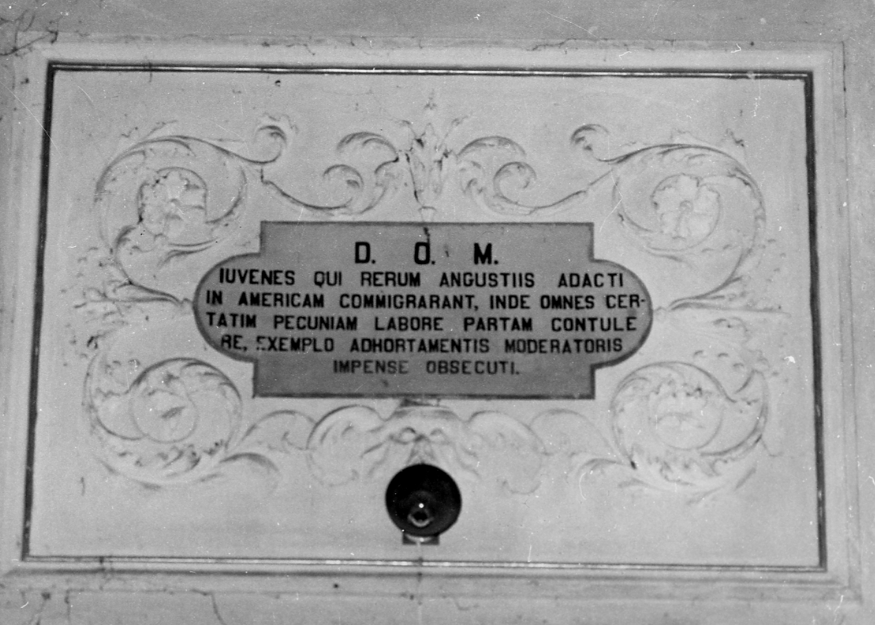 - ISCRIZIONI sulla cartella - D. O. M. ALOISIO FRASCA COMMUNITATIS/ MODERATORE STUDIO ET MUNIFICENTIA PRAEEUNTE/ CETERIS STIPEM CONFERENTIBUS FF FENEZIANI/ IOANNES ET BERARDINUS PLASTARUM FACILE/ PRINCIPES ET THEOPHILUS PATINI/ PICTOR EGREGIUS TEMPLUM HOC EXOR/ NANDUM SUSCEPERUNT ANNO MCM - lettere capitali -