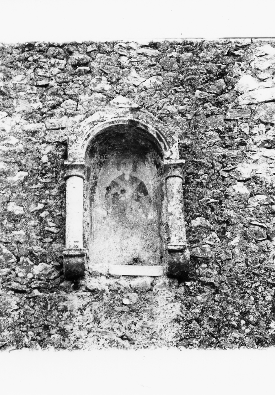 L'AFFRESCO E' OSPITATO IN UNA NICCHIA SUL LATO FRONTALE DEL CAMPANILE, INQUADRATO DA UNA EDICOLA FORMATA DA DUE COLONNINE CON ARCO A TUTTO SESTO TERMINANTE A CUSPIDE