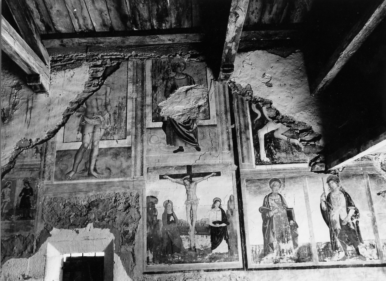 IL COMPLESSO OCCUPA TUTTA LA PARETE DESTRA ED IN PARTE E' COMPROMESSO DALLA CADUTA DEGLI INTONACI. NON COSTITUISCE UNITA' NARRATIVA ED I RIQUADRI SONO POSIZIONATI IN MODO ASIMMETRICO. PROBABILMENTE SONO TUTTI EXVOTO