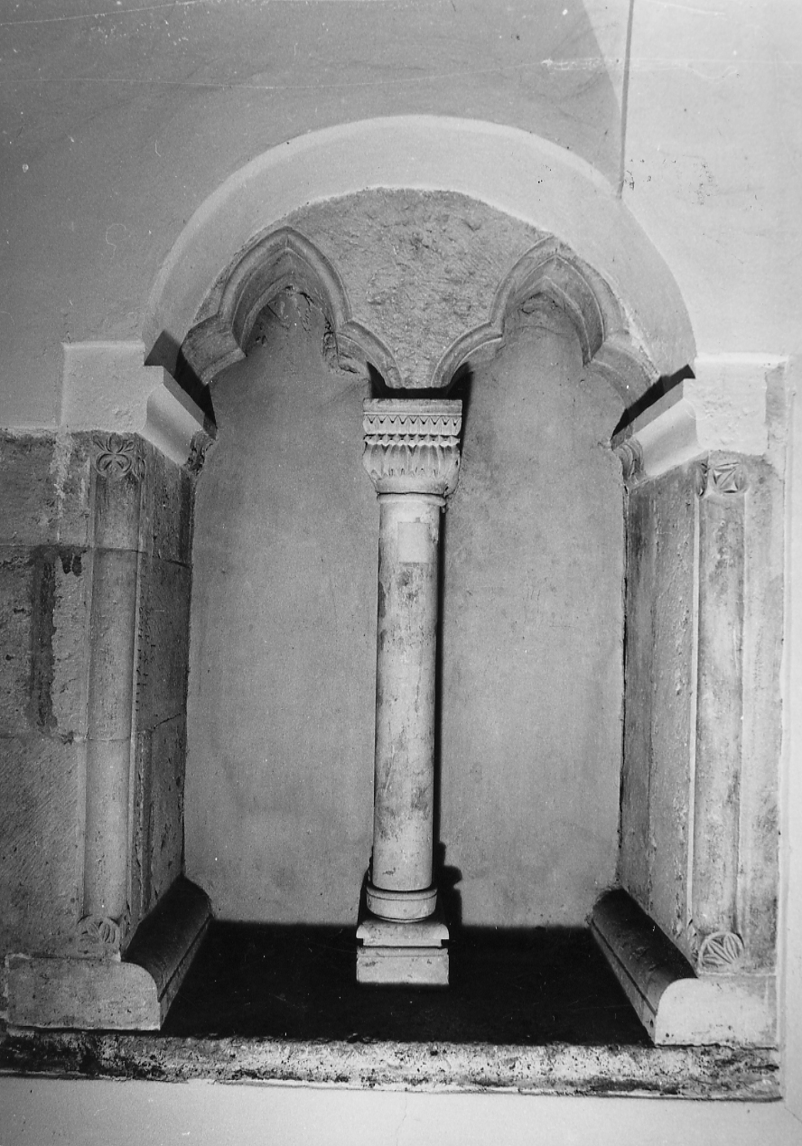 APERTURA A TUTTO SESTO. INTERNAMENTE ARCHI TRILOBATI SOSTENUTI DA UNA COLONNINA BINATA CON CAPITELLO SCOLPITO A MOTIVO DI FOGLIE CON CORNICETTA CENTRALE A PUNTA DI DIAMANTE. IMPOSTE CON RESIDUI DI CORNICI SOLPITE A PALMETTE E MOTIVI DI FOGLIE ALLE ESTREMITA' DELLE COLONNE ANTERIORI